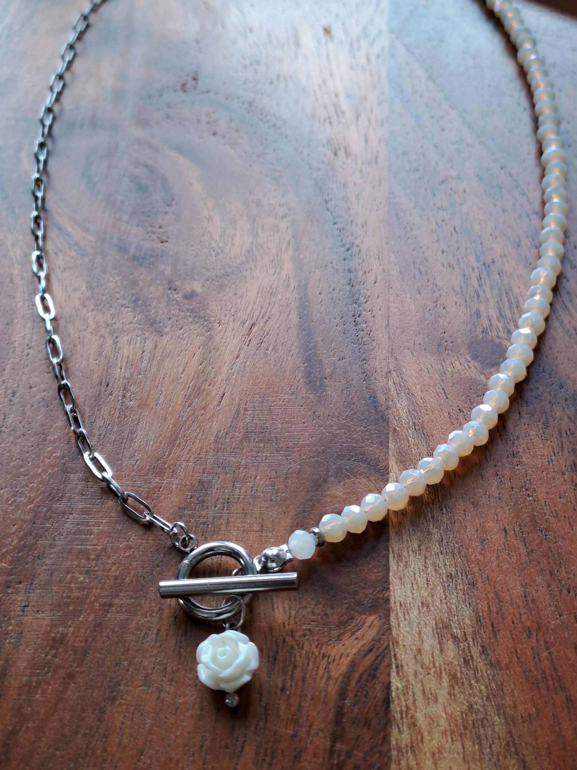 Χειροποίητο κολιέ με μεγάλο στρογγυλό κούμπωμα και τριανταφυλλάκι κρεμαστό. Κατά το ήμισυ αλυσίδα και ροζ παλ κρυσταλλάκια.