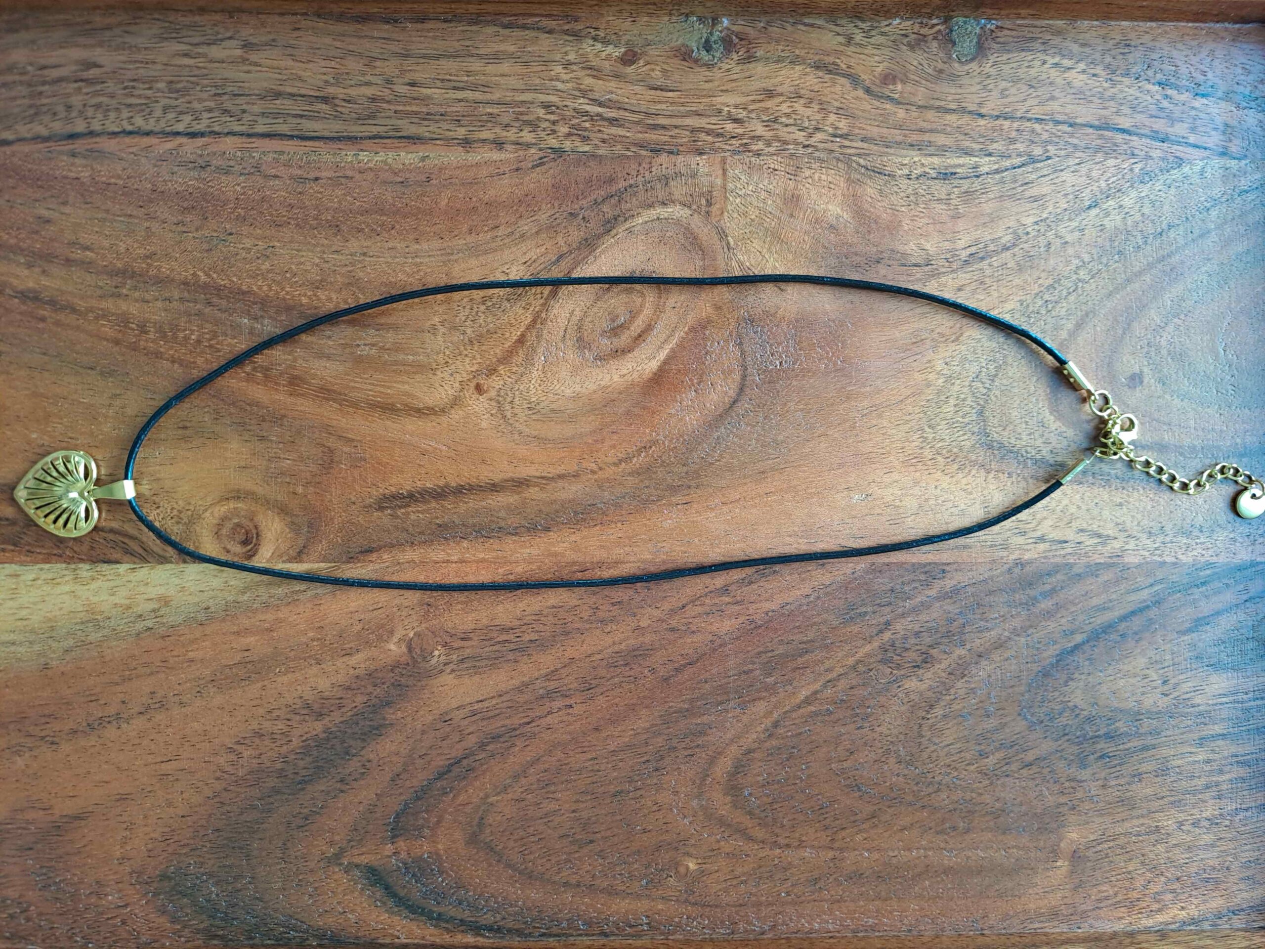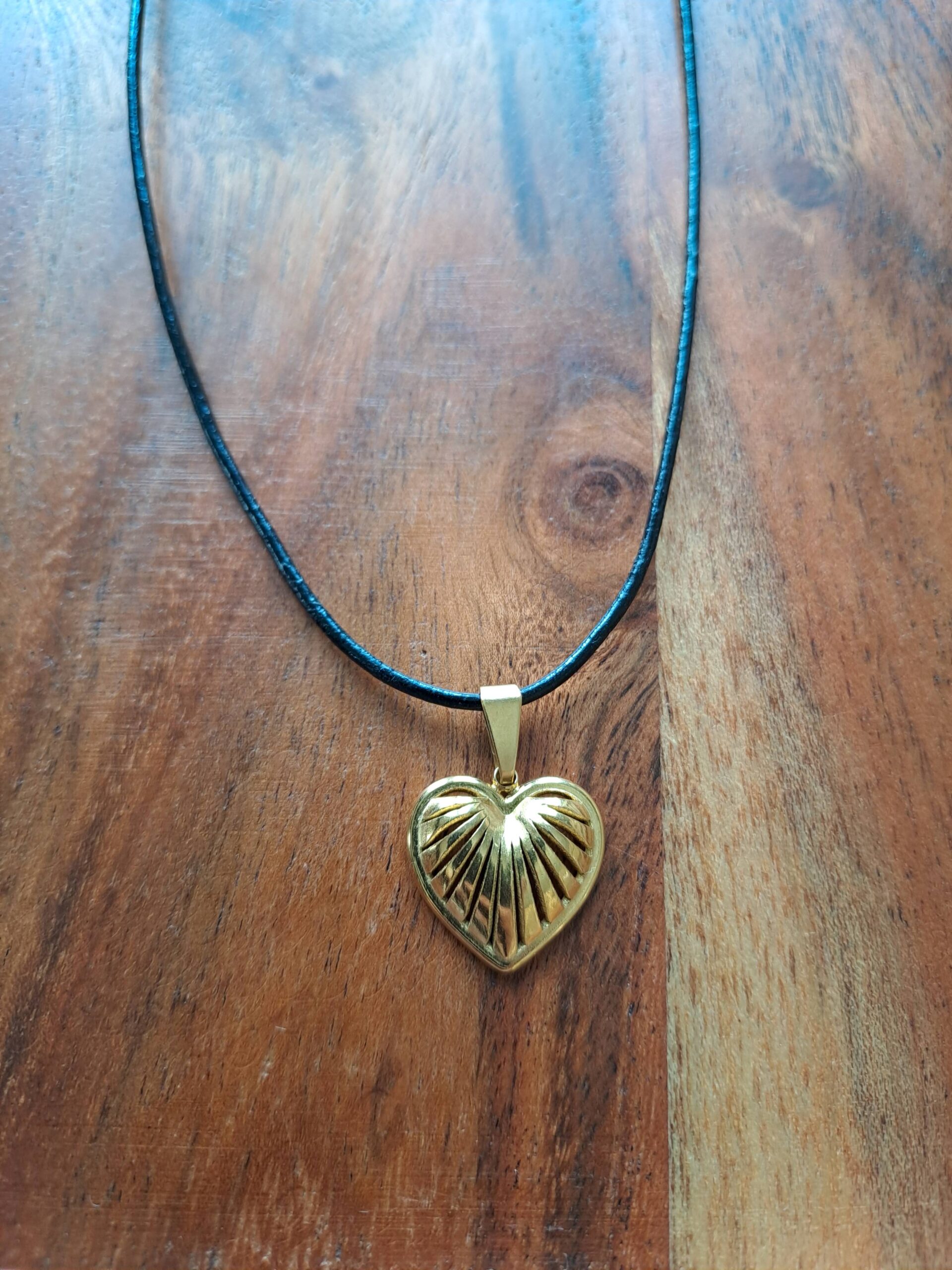 Κολιέ με κρεμαστή διάτρητη καρδιά σε χρυσό χρώμα και δερμάτινο κορδόνι.