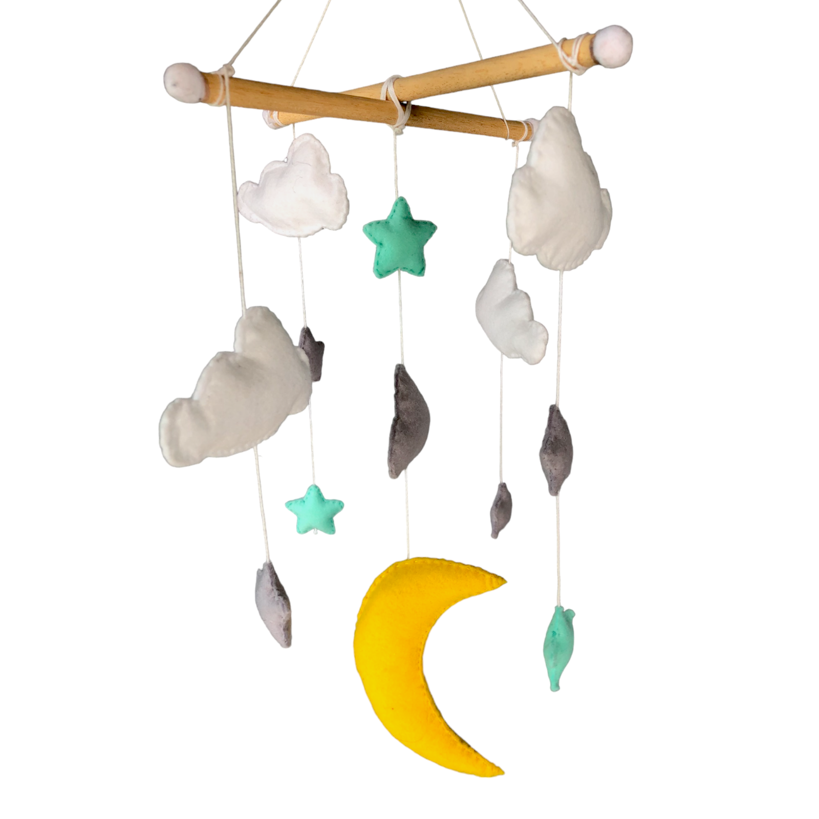 Ένα φωτεινό φεγγάρι, περιτριγυρισμένο από αστεράκια και σύννεφα, φέρνει την ηρεμία της νύχτας στο δωμάτιο του μωρού. Καθώς το mobile κινείται απαλά, βοηθά το μωράκι να συγκεντρωθεί, να χαλαρώσει και να ταξιδέψει γλυκά στον κόσμο των ονείρων. Όλα τα στοιχεία έχουν ραφτεί στο χέρι, με κομμάτια υφάσματος που αποκτούν δεύτερη ζωή, μετατρέποντας το mobile σε ένα τρυφερό, οικολογικό παραμύθι.