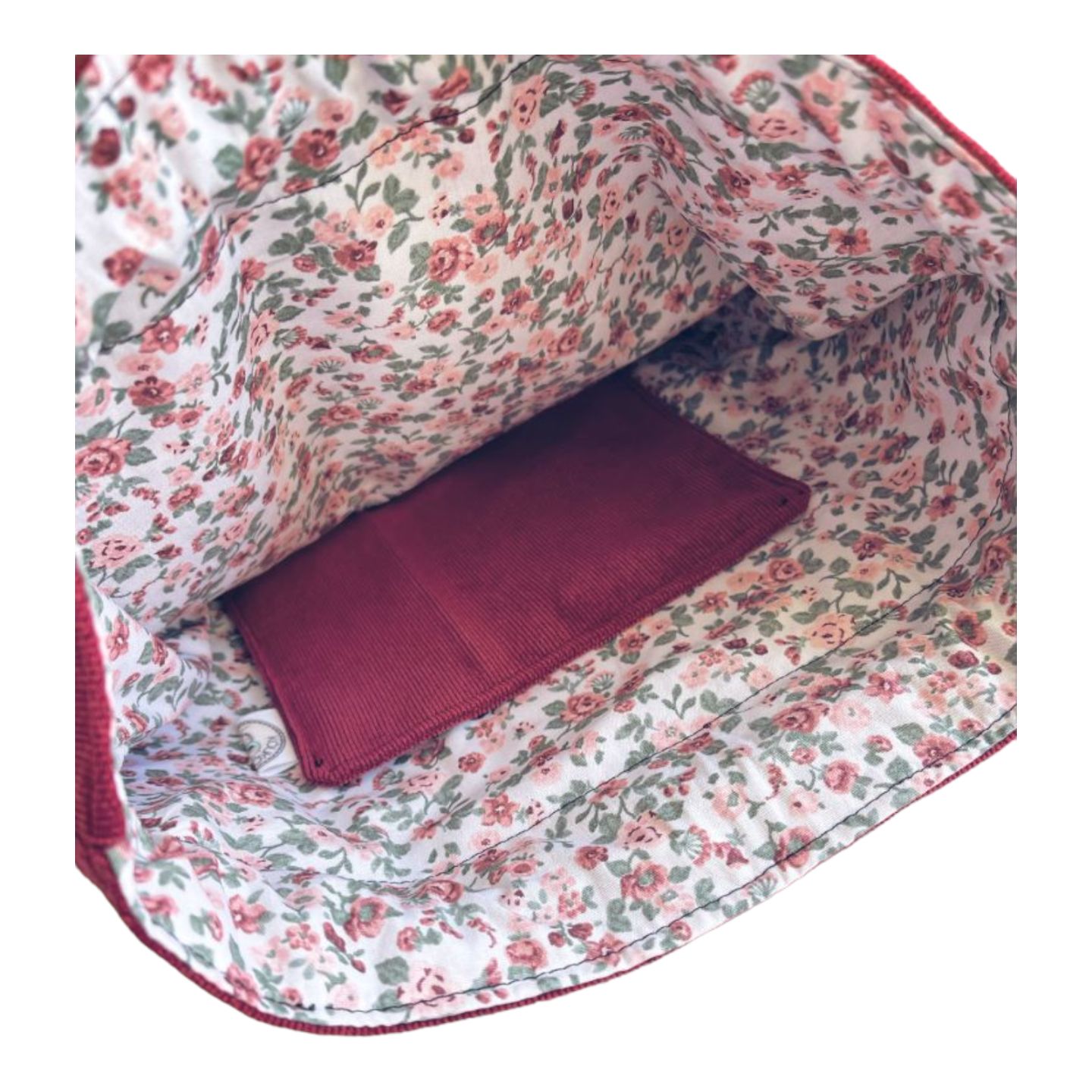 Απόλαυσε το φθινόπωρο με μια τσάντα που συνδυάζει κομψότητα και λειτουργικότητα. Από έξω, το βαθύ μπορντό ύφασμα θυμίζει το χρώμα των φύλλων που πέφτουν, ενώ μέσα κρύβεται μια έκρηξη από λουλουδάκια σε ρομαντικό ύφος. Η εσωτερική τσέπη προσφέρει άνεση στην οργάνωση, ιδανική για κλειδιά, κινητό ή μικρά προσωπικά αντικείμενα. Ραμμένη στο χέρι με προσοχή στη λεπτομέρεια, η τσάντα αυτή είναι το ιδανικό σου ταίρι για τις καθημερινές βόλτες και τα φθινοπωρινά σου ταξίδια.