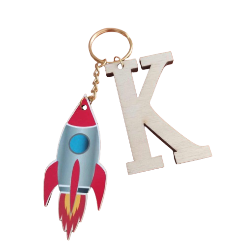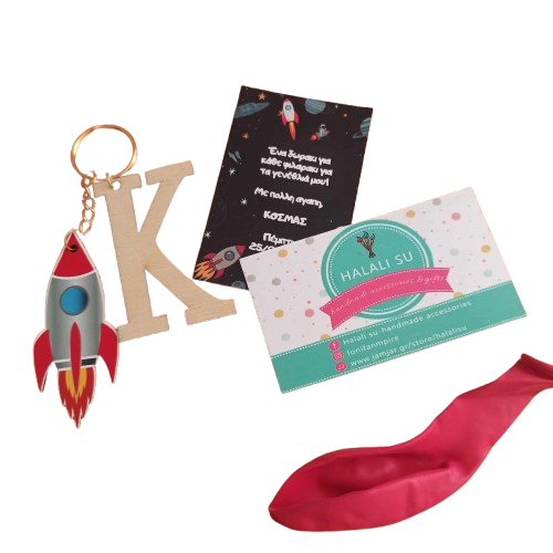 Υλικά: επίχρυσος μεταλλικός κρίκος με αλυσίδα , ξύλινος πύραυλος 7 cm και ξύλινο μονόγραμμα 6 cm.
