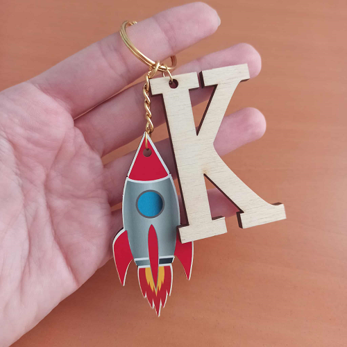 15 ξύλινα μπρελόκ με ξύλινο μονόγραμμα και πύραυλο