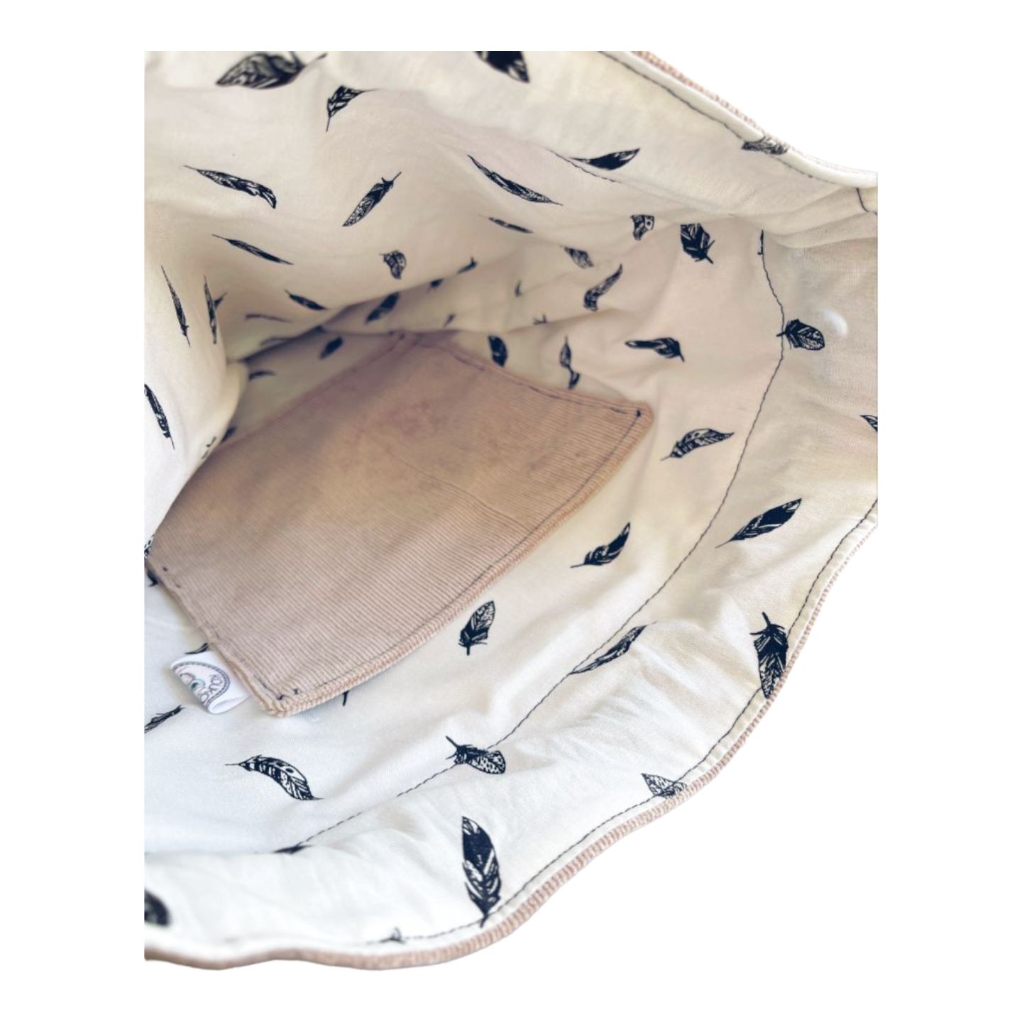 Μια τσάντα που αποπνέει απλότητα και γοητεία. Το εξωτερικό της, σε ζεστή μπεζ απόχρωση, ταιριάζει με κάθε φθινοπωρινό look. Όμως, το πραγματικό μυστικό της κρύβεται στο εσωτερικό: ένα υφασμάτινο lining με παιχνιδιάρικα φτερά που σε ταξιδεύουν στη φύση. Με εσωτερική τσέπη για πρακτική χρήση και κορδόνια που προσφέρουν άνεση, αυτή η χειροποίητη τσάντα θα γίνει η καθημερινή σου αγαπημένη.