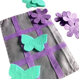 Μια κλασική τρίλιζα που όμως μεταμορφώθηκε σε ένα χαρούμενο παιχνίδι με πεταλούδες και λουλούδια! Χειροποίητη από μαλακό felt, με πιόνια που αποθηκεύονται μέσα στη θήκη της, ώστε να μη χάνεται ποτέ κανένα. Η πίσω πλευρά της θήκης κρύβει το ταμπλό του παιχνιδιού, έτοιμο για αμέτρητους γύρους διασκέδασης. Ένα παιχνίδι που καλλιεργεί τη λογική, τη συγκέντρωση αλλά και το χαμόγελο των παιδιών.