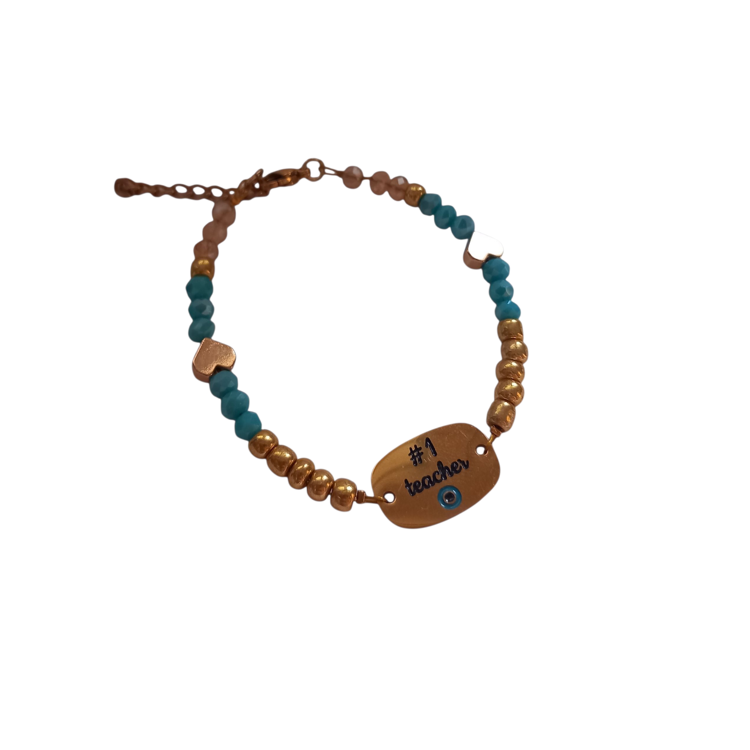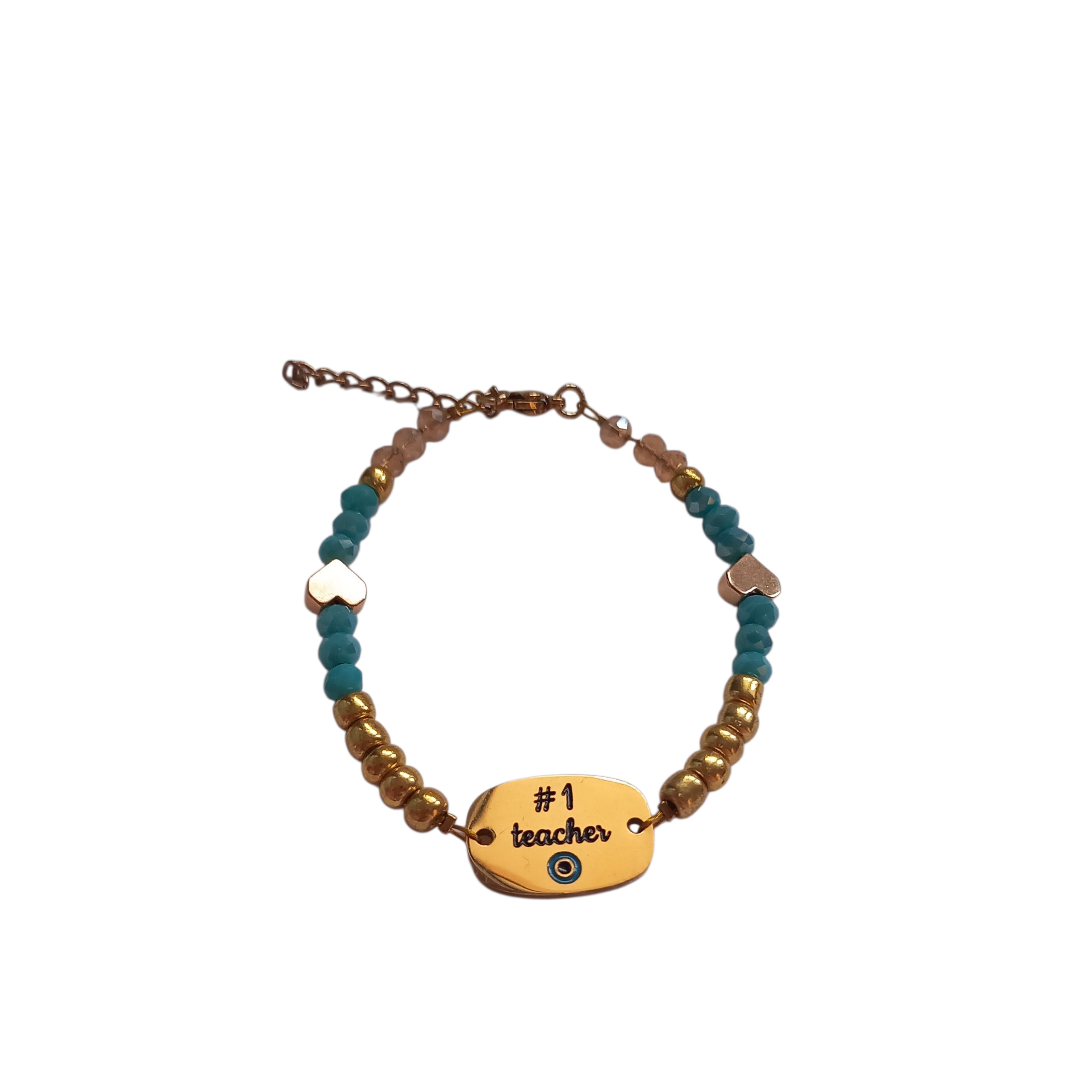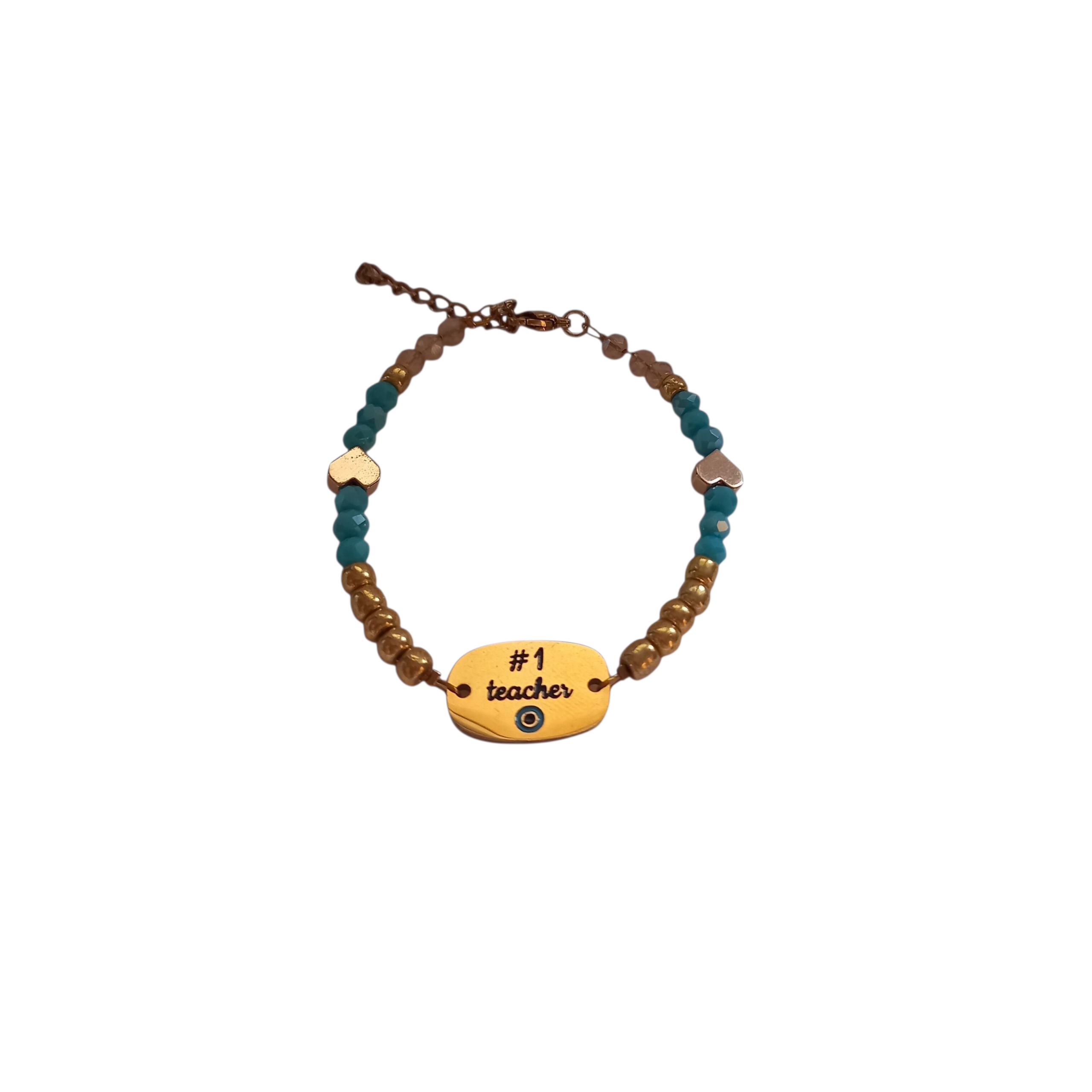 Χειροποίητο βραχιόλι με ατσάλινο μοτίφ #1teacher, μεταλλικά στοιχεία από ορείχαλκο και χάντρες. Κουμπώνει με ατσάλινο καβουράκι και ατσάλινη αλυσίδα αυξομείωσης.