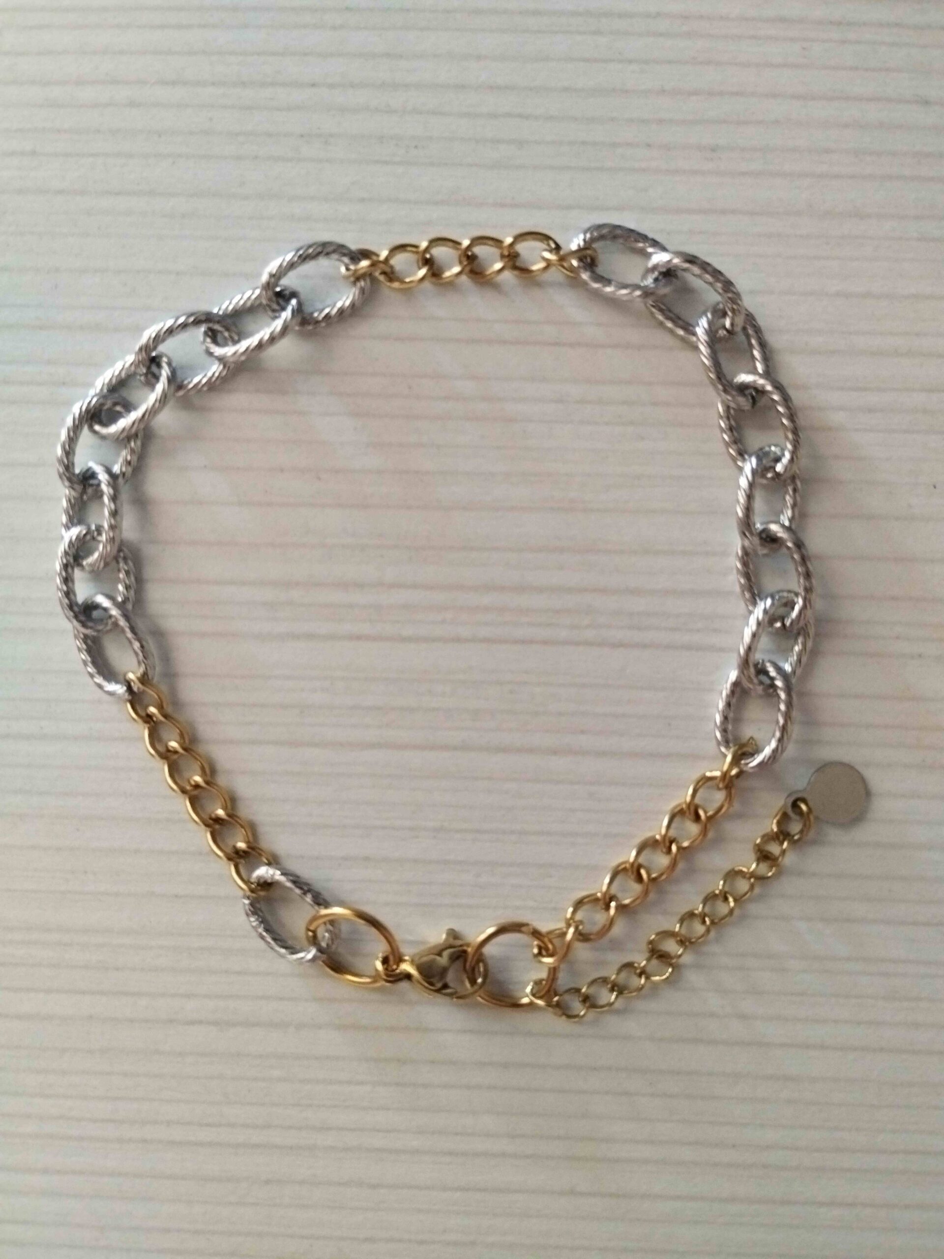 Χειροποίητο , ατσάλινο βραχιόλι 17 εκατοστά μικτού χρώματος (χρυσό και ασημί) .Αποτελείται από δύο ατσάλινες αλυσίδες .Η μία είναι ατσάλινη , ασημί με οβάλ κρίκο 9,5επί6mm και η δεύτερη είναι ατσάλινη , χρυσή 5επί3,5mm . Το βραχιόλι έχει κούμπωμα ατσάλινο , χρυσό παπαγαλάκι 9 mm και αλυσίδα προέκτασης 7με 8 εκατοστά το τελείωμα της οποίας κοσμεί μίνι ,ατσάλινο ασημί φλουρί 4mm .Φοριέται σε όλες τις περιστάσεις και θα δώσει στις εμφανίσεις σας μια εκλεπτυσμένη και σικάτη εικόνα .