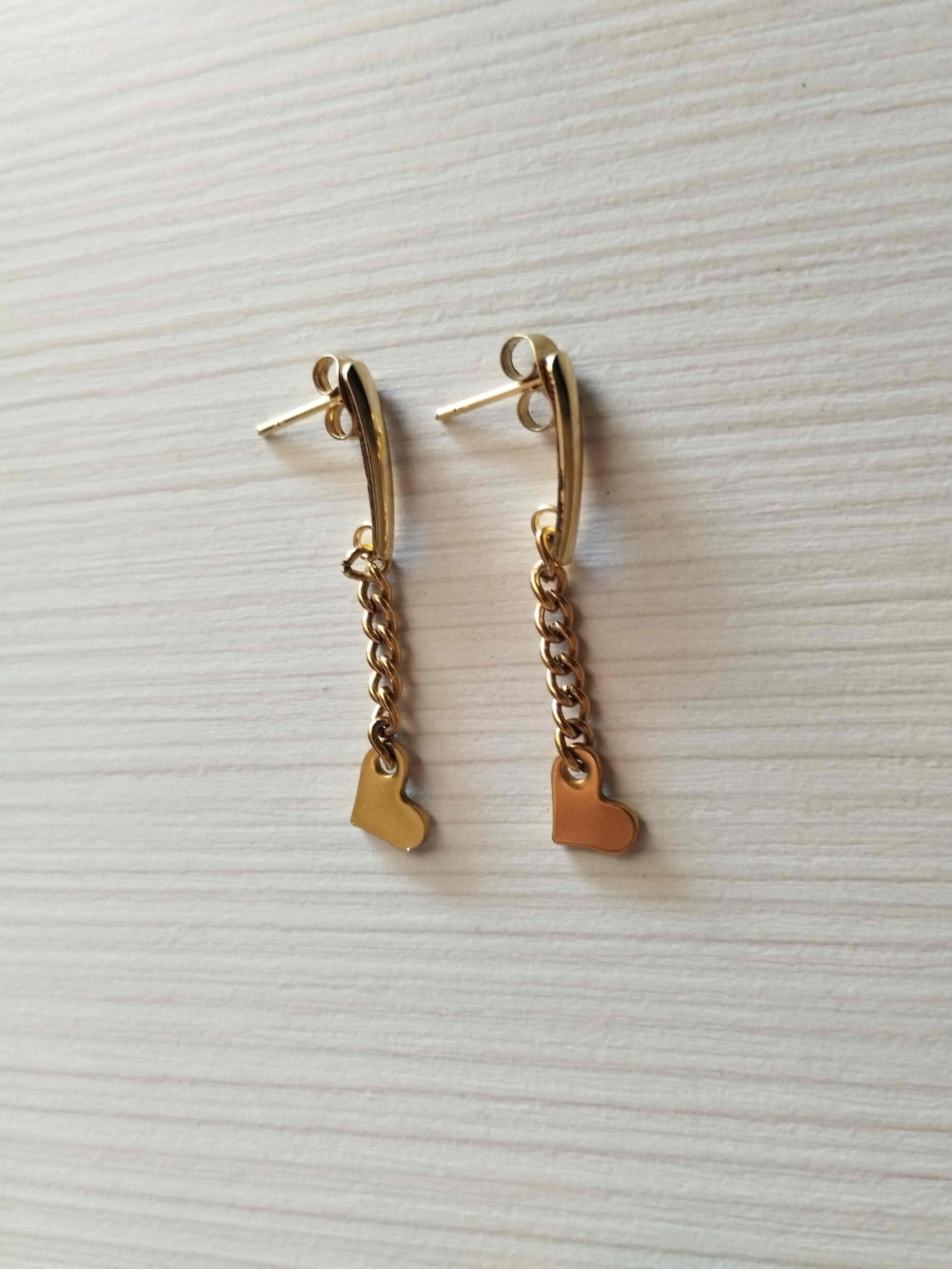 Χειροποίητα , ατσάλινα χρυσά σκουλαρίκια 4 εκατοστά . Έχουν βάσεις ατσάλινα χρυσά καρφιά 15επί3mm και κρεμαστά στοιχεία ατσάλινες , χρυσές αλυσίδες μεσαίου μεγέθους γκουρμέ 4επί3mm , οι οποίες στο τελείωμά τους έχουν μίνι ατσάλινες , χρυσές καρδιές 7,5επί4mm . Τα κουμπώματα των σκουλαρικιών είναι ατσάλινες χρυσές ασφάλειες ΄- πεταλούδες . Είναι ευκολοφόρετα καθώς μπορούν να φορεθούν από το πρωί ως το βράδυ σε όλες τις περιστάσεις .Είναι κομψά και λεπτεπίλεπτα .