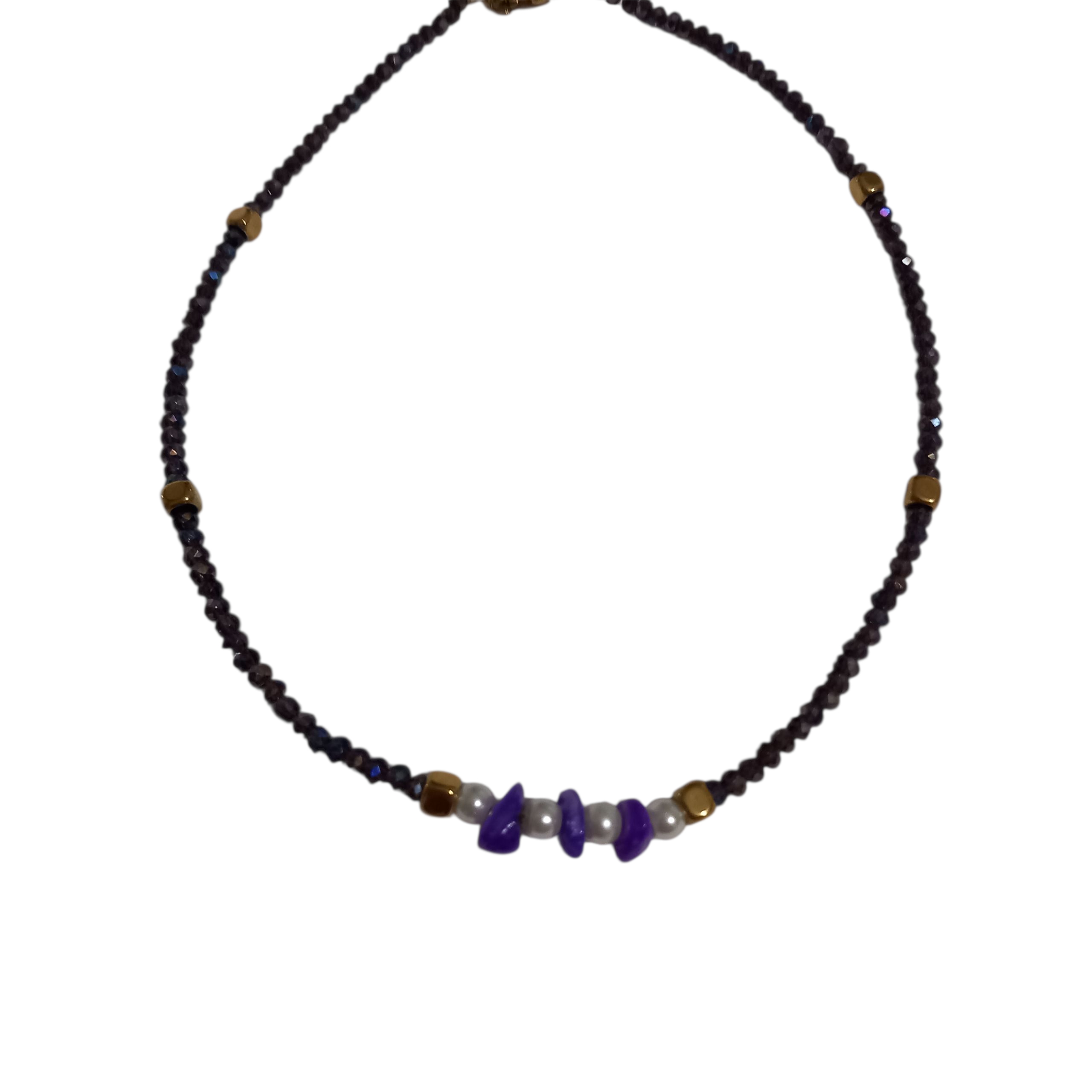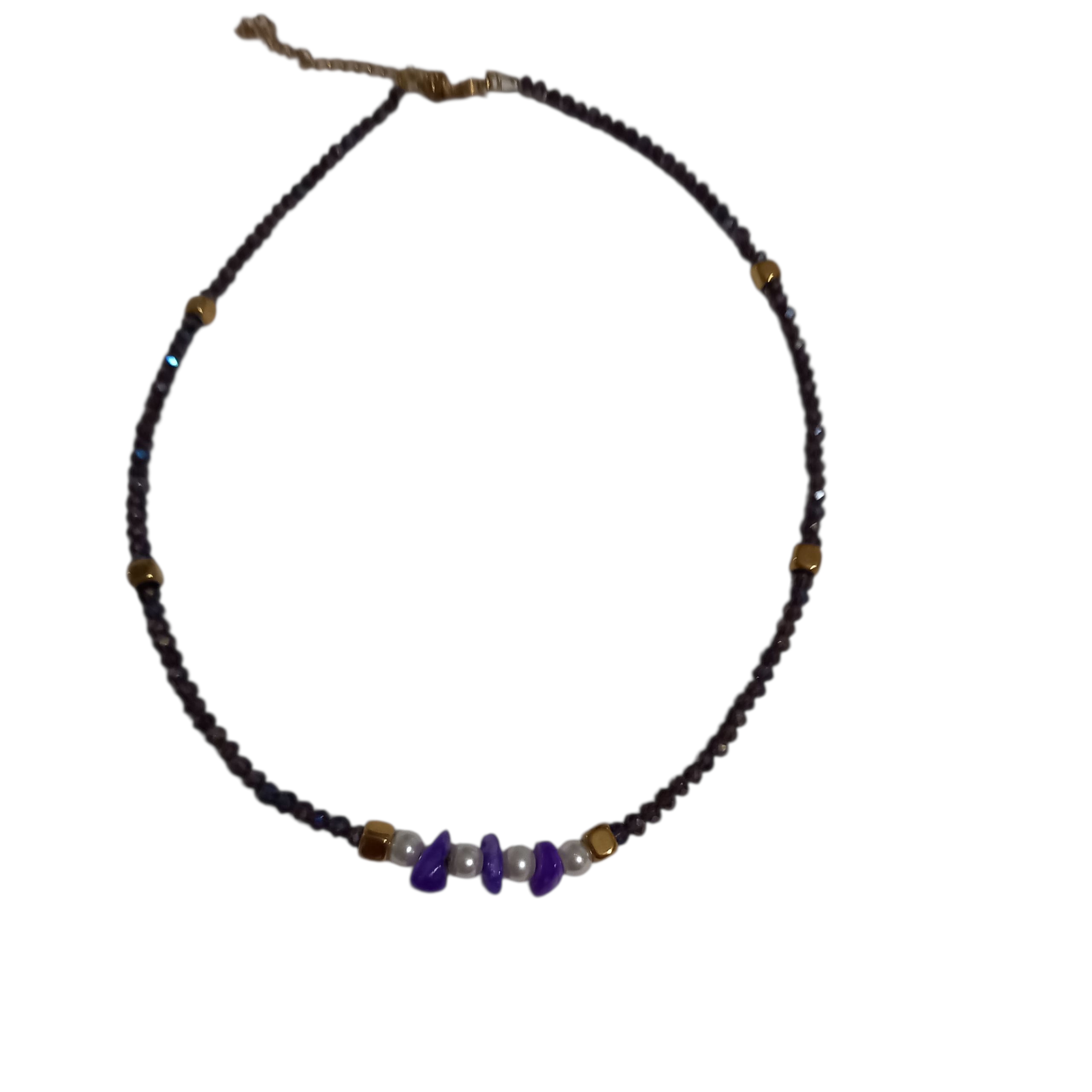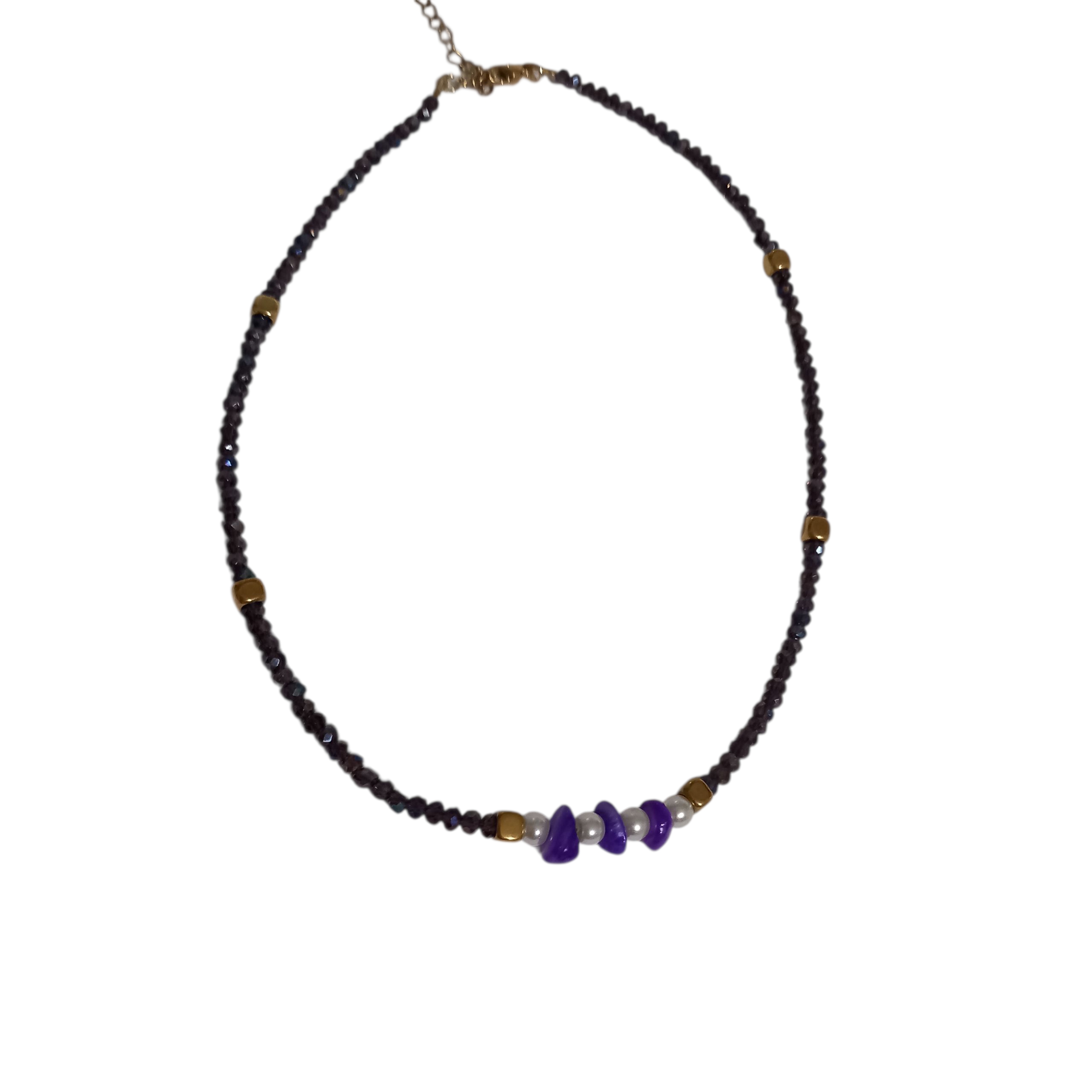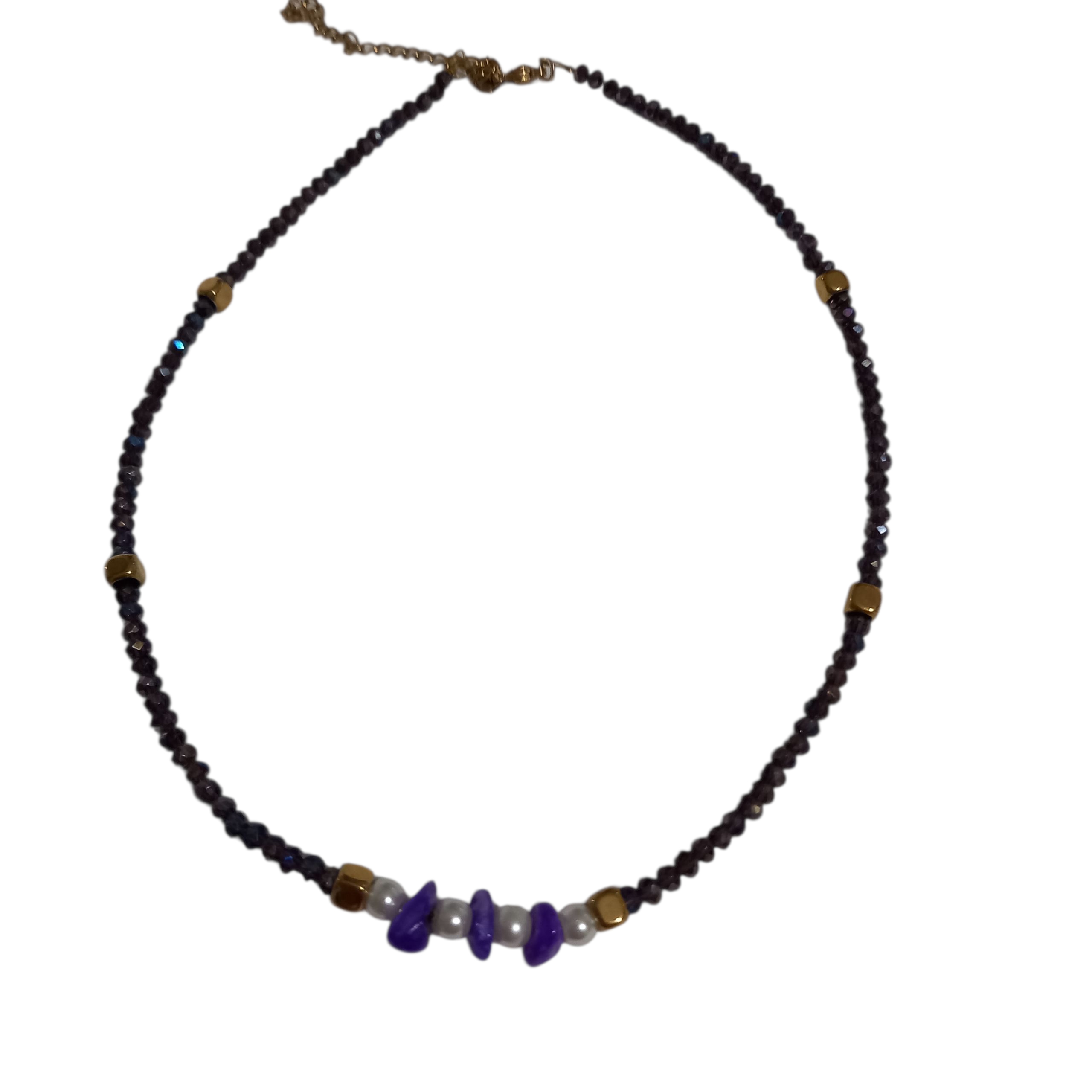 Χειροποίητο κολιέ με τσιπς, πέρλες, χάντρες και μεταλλικά στοιχεία. Κουμπώνει με ατσάλινη αλυσίδα αυξομείωσης και ατσάλινο καβουράκι.