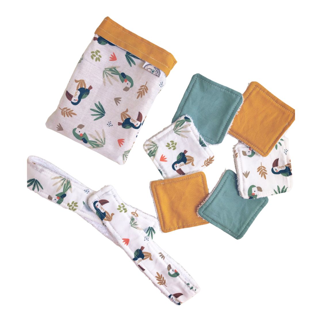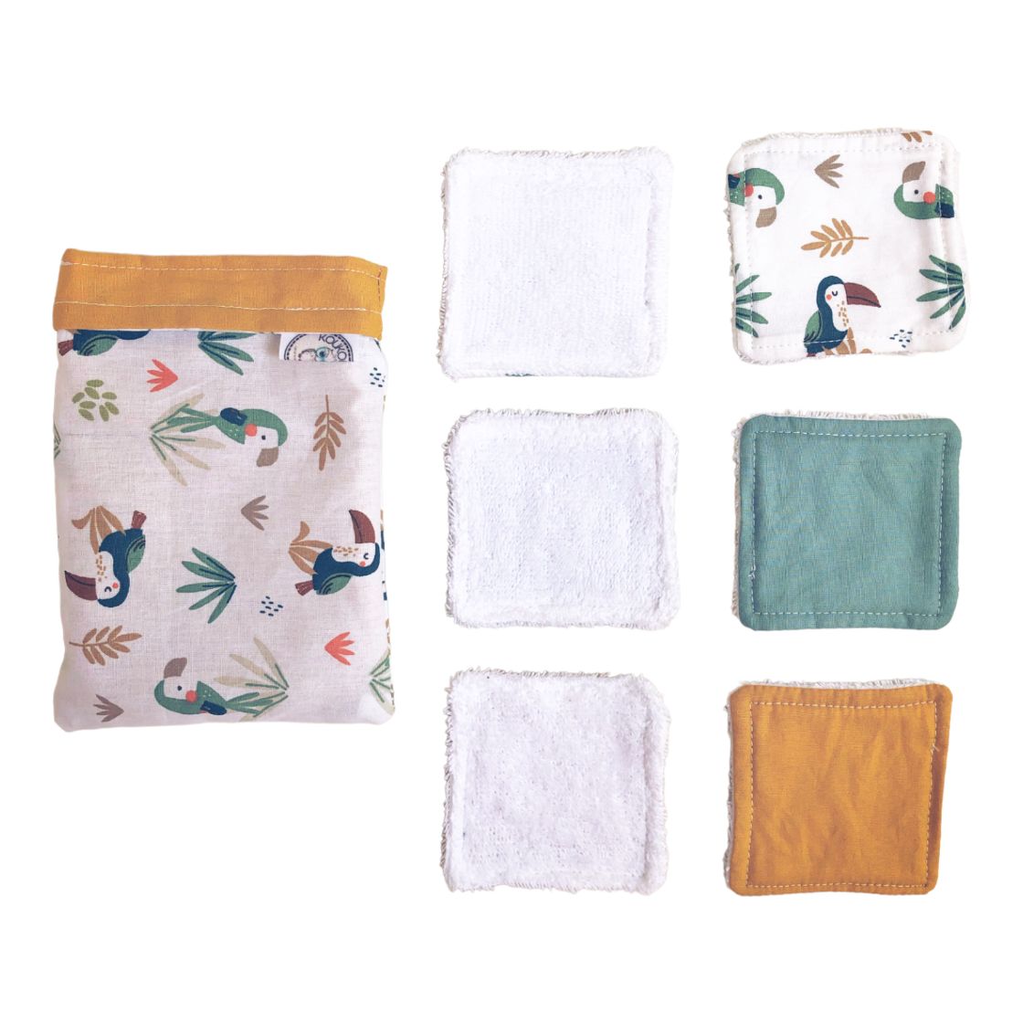 Ένα χαρούμενο σετ με εξωτικούς τουκάνους, που φέρνει καλοκαιρινή διάθεση στην καθημερινή σου ρουτίνα. Οι δίσκοι ντεμακιγιάζ με τα φωτεινά χρώματα σε πράσινο και μουσταρδί συνδυάζονται με μια υφασμάτινη θήκη και κορδέλα που δίνουν στυλ ακόμη και στη φροντίδα του δέρματός σου.