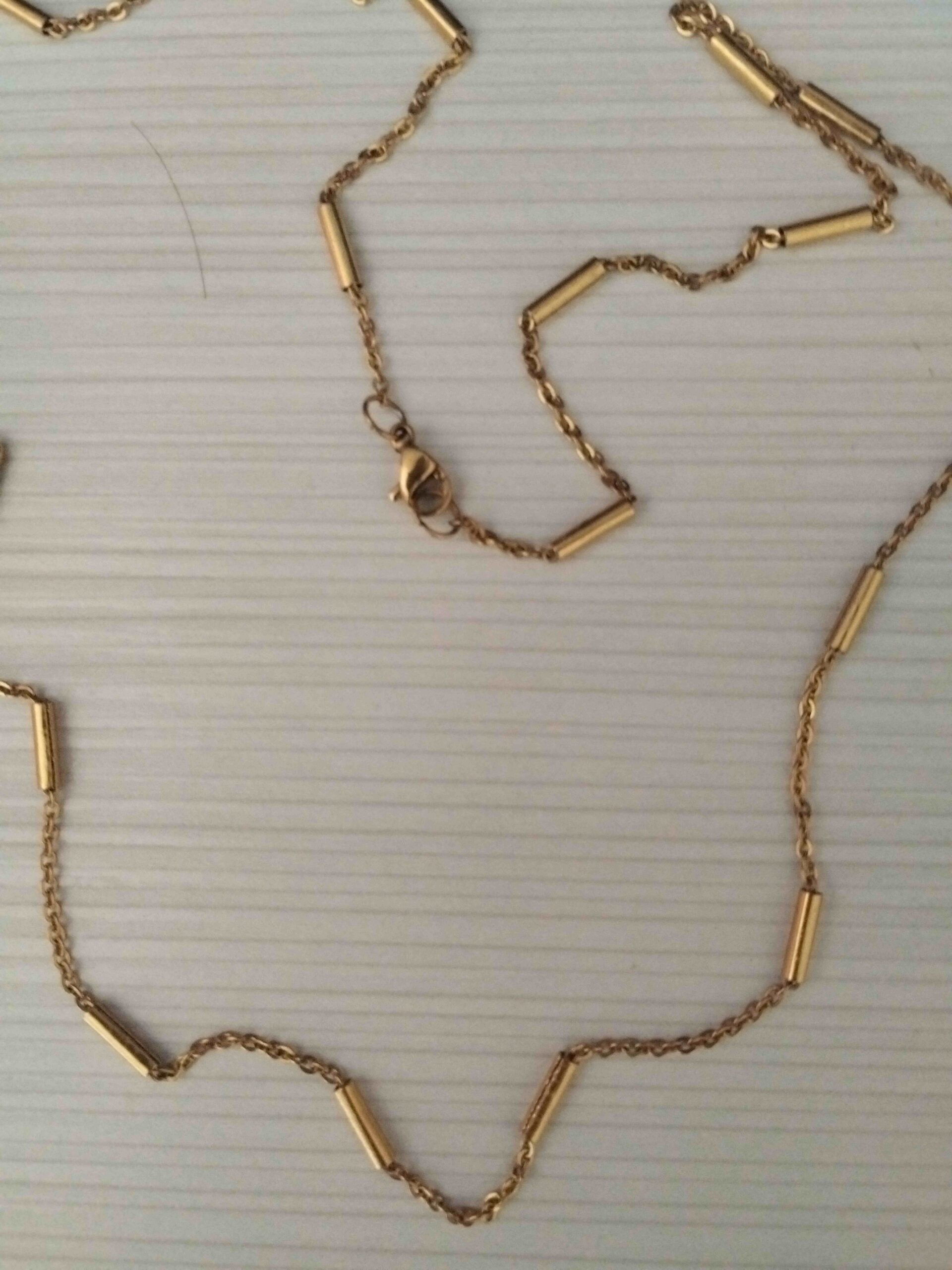 Χειροποίητο ατσάλινο , χρυσό κολιέ 60cm . Η αλυσίδα του είναι ατσάλινη , χρυσή με οβάλ , πλακέ κρίκο και ατσάλινες, χρυσές μπάρες 2επί1,6mm . Το κούμπωμα του κολιέ είναι ατσάλινο , χρυσό παπαγαλάκι 9mm .