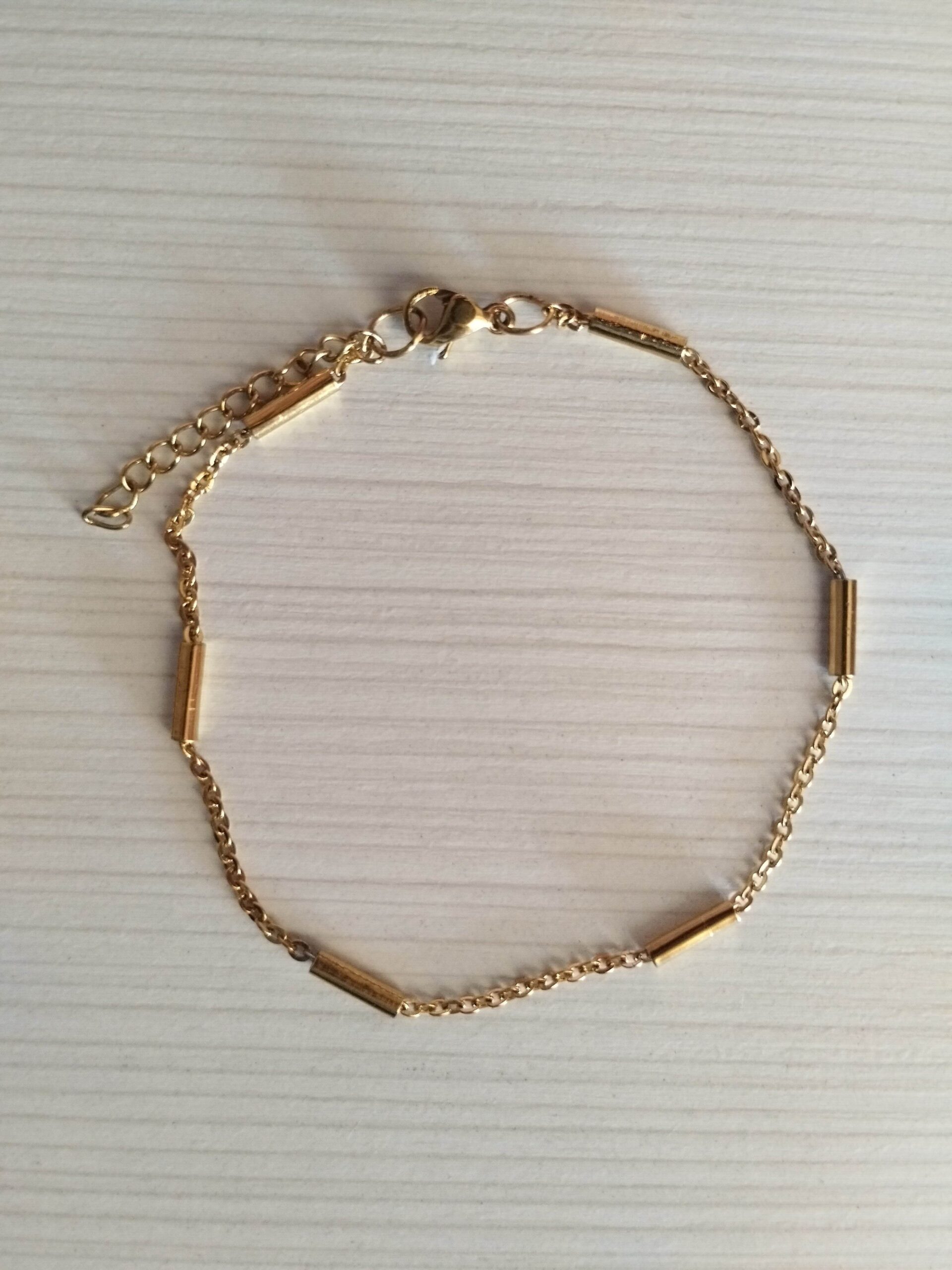 Χειροποίητο , ατσάλινο , χρυσό βραχιόλι 18 με 19 εκατοστά με ατσάλινη , χρυσή αλυσίδα , η οποία αποτελείται από οβάλ , πλακέ κρίκους και ατσάλινες , χρυσές μπάρες 2επί1,6mm . Το κούμπωμά του είναι ατσάλινο , χρυσό παπαγαλάκι 9mm . Στο βραχιόλι έχει προστεθεί , όπως άλλωστε σε όλα μας τα βραχιόλια και τα κολιέ ατσάλινη , χρυσή αλυσίδα προέκτασης 7με8 εκατοστά 5επί3,5mm .Το τελείωμα της αλυσίδας προέκτασης κοσμείται από ατσάλινη , χρυσή μπάρα 2επί1,6mm . Είναι ανθεκτικό και θα δώσει στις εμφανίσεις σας έναν εκλεπτυσμένο και σικάτο χαρακτήρα .