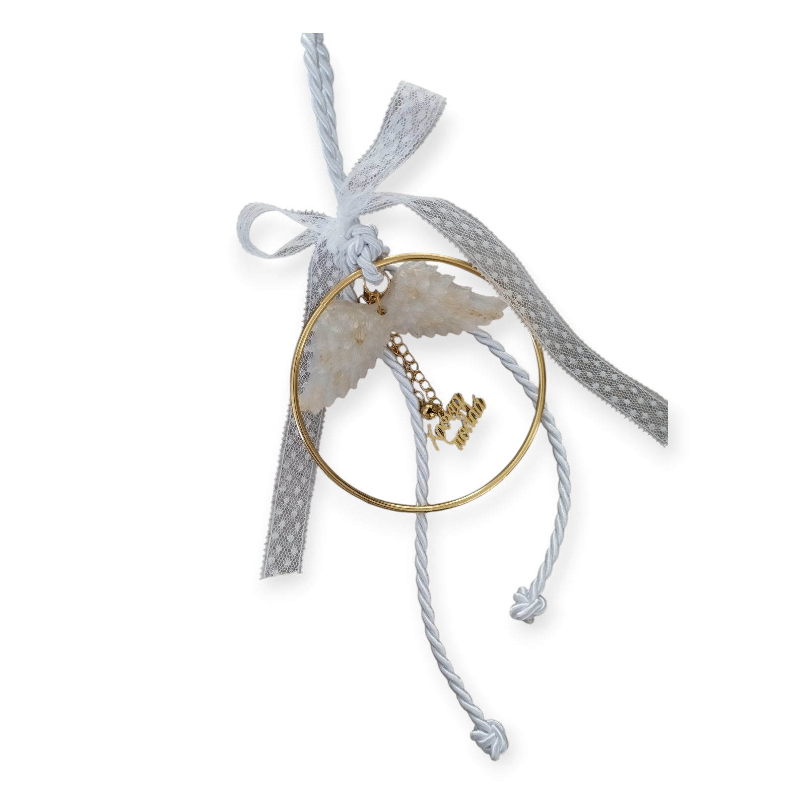 Κομψό χειροποίητο γούρι με φτερά αγγέλου από υγρό γυαλί και χρυσές λεπτομέρειες. Ένα διακριτικό γούρι που συμβολίζει προστασία και καλή τύχη — ιδανικό δώρο για όσους αγαπάς ή για να συνοδεύσει τη νέα χρονιά στο σπίτι σου. Κρεμιέται εύκολα σε πόρτα, δέντρο ή γραφείο και προσθέτει μια ήρεμη, φωτεινή παρουσία στον χώρο!
