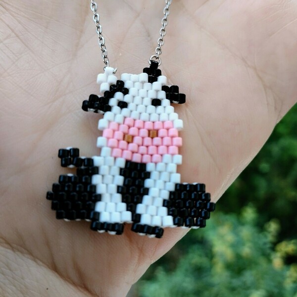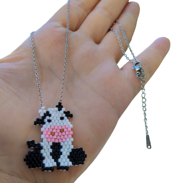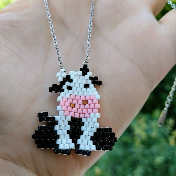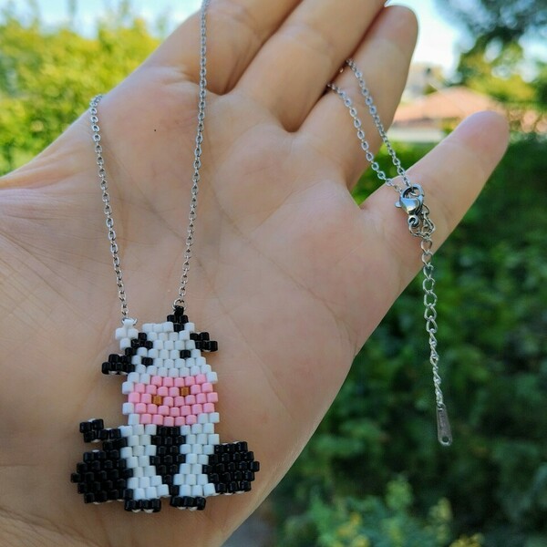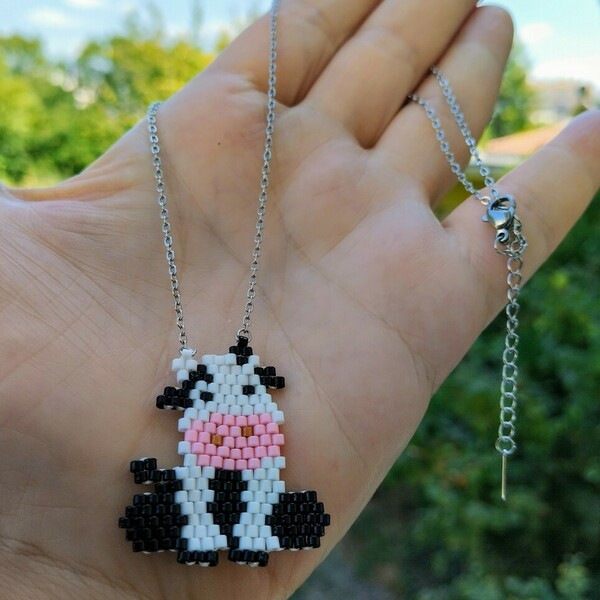 Αυτό το ξεχωριστό χειροποίητο κολιέ διαθέτει μενταγιόν με ένα γλυκό σχέδιο αγελαδίτσας, φτιαγμένο με υψηλής ποιότητας χάντρες Miyuki Delica. Το μενταγιόν, με διαστάσεις 3×3 εκ., κρέμεται από ατσάλινη αλυσίδα, εξασφαλίζοντας ανθεκτικότητα και κομψότητα.
