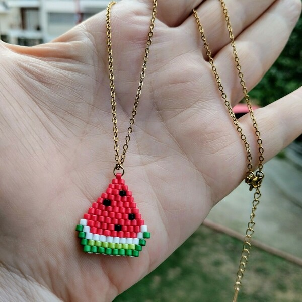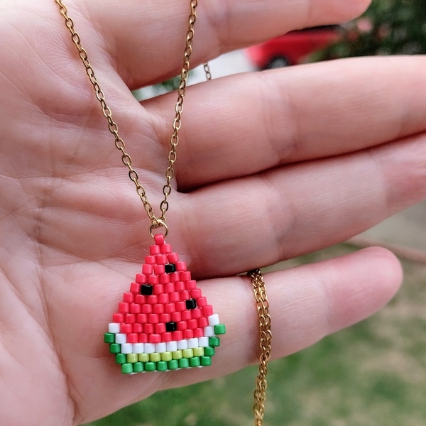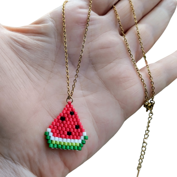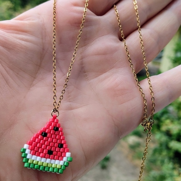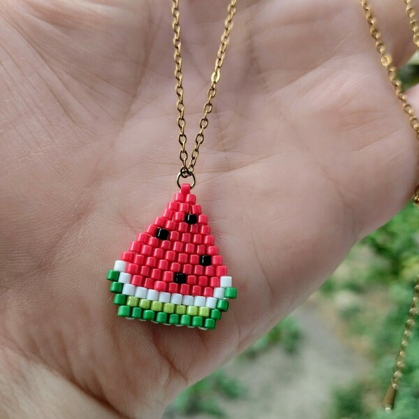 Ατσάλινο κολιέ με μενταγιόν σε σχήμα μικρής φέτας καρπουζιού, ιδανικό για ένα καλοκαιρινό, κομψό και ξεχωριστό στυλ. Το μενταγιόν είναι φτιαγμένο με υψηλής ποιότητας χάντρες Miyuki Delica, σε χρώματα πράσινου, ανοιχτού πράσινου, άσπρου, κόκκινου και μαύρου για τα σποράκια.
