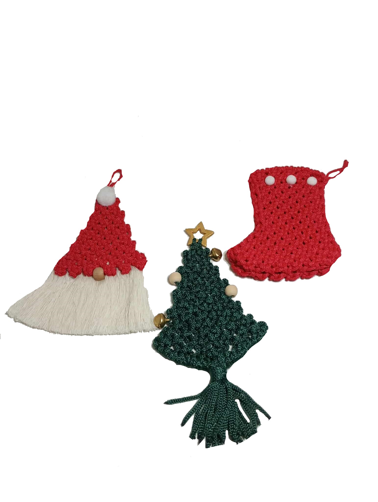 Τρία υπέροχα χριστουγεννιάτικα στολίδια Άγιος Βασίλης δέντρο μπότα με την τεχνική macrama ( κομποδεκτική )