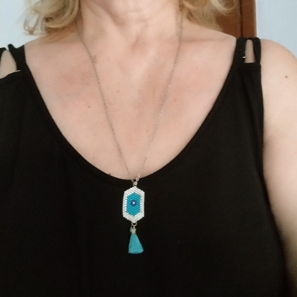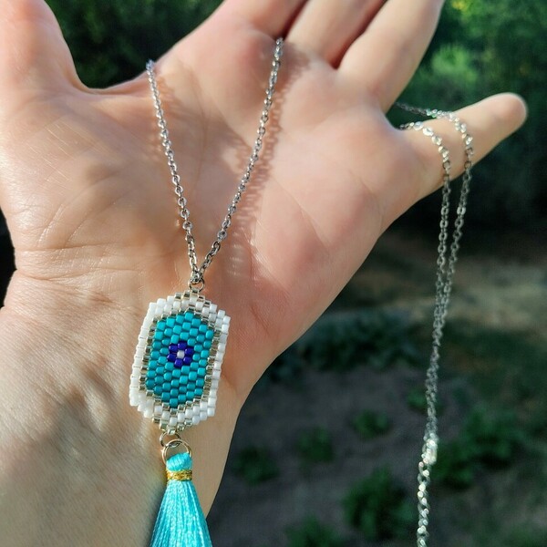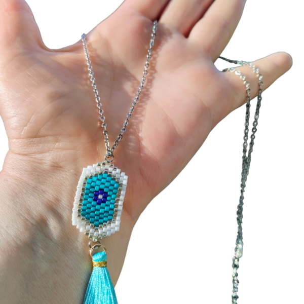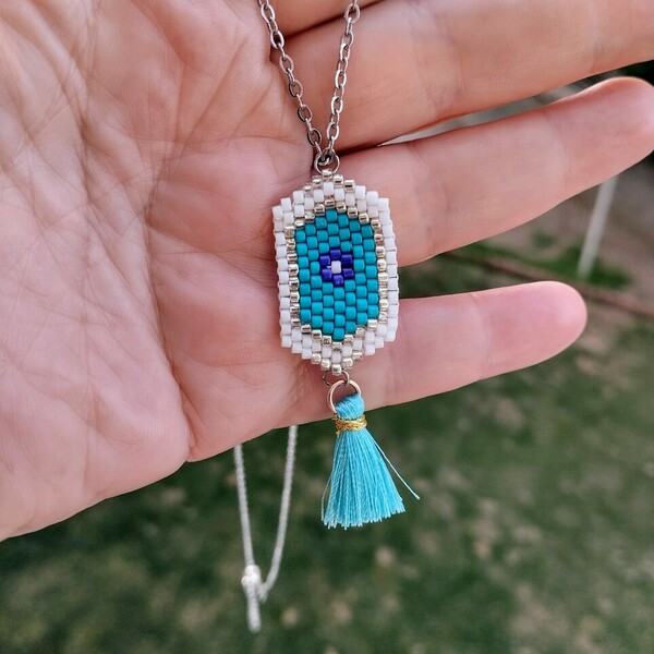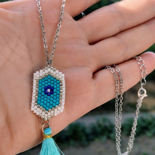 Είναι ένα υπέροχο ατσάλινο χειροποίητο κολιέ μενταγιόν μάτι σε γεωμετρικό σχέδιο, που στο τελείωμα του έχει μία όμορφη τυρκουαζ φουντίτσα. Τα χρώματα του είναι άκρως καλοκαιρινά, συνδυάζοντας λευκό, ασημί, τυρκουάζ, μπλε και στο κέντρο του μια άσπρη χαντρούλα. Η τυρκουάζ φουντίτσα δένει το σύνολο και προσφέρει ένα υπέροχο αποτέλεσμα!