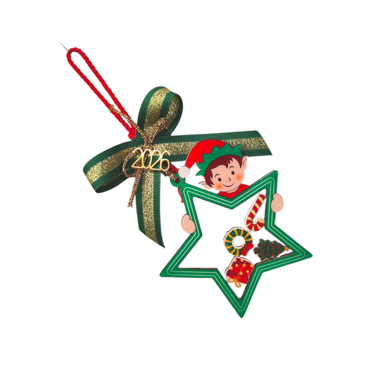 Γούρι-αστέρι με παιχνιδιάρικο ξωτικό που κλέβει την παράσταση! Στολισμένο με μινιατούρες όπως δέντρο, στεφάνι, δώρο και καραμέλα, και φιόγκο σε πρασινο-χρυσό. Το μεταλλικό στοιχείο “2026” προσθέτει συλλεκτική αξία. Ένα γούρι που φέρνει χαρά, τύχη και γιορτινή ατμόσφαιρα στο χώρο σου.