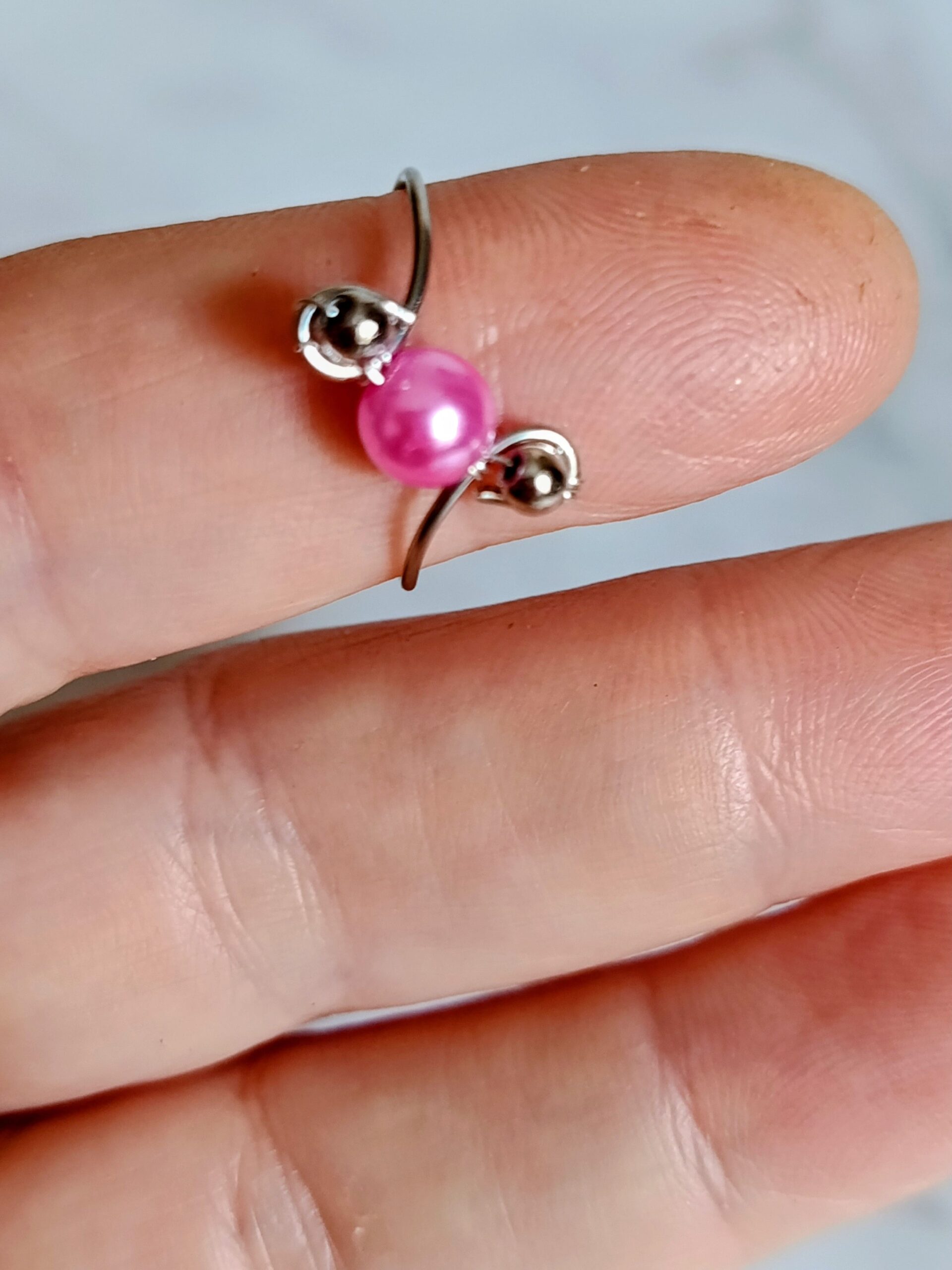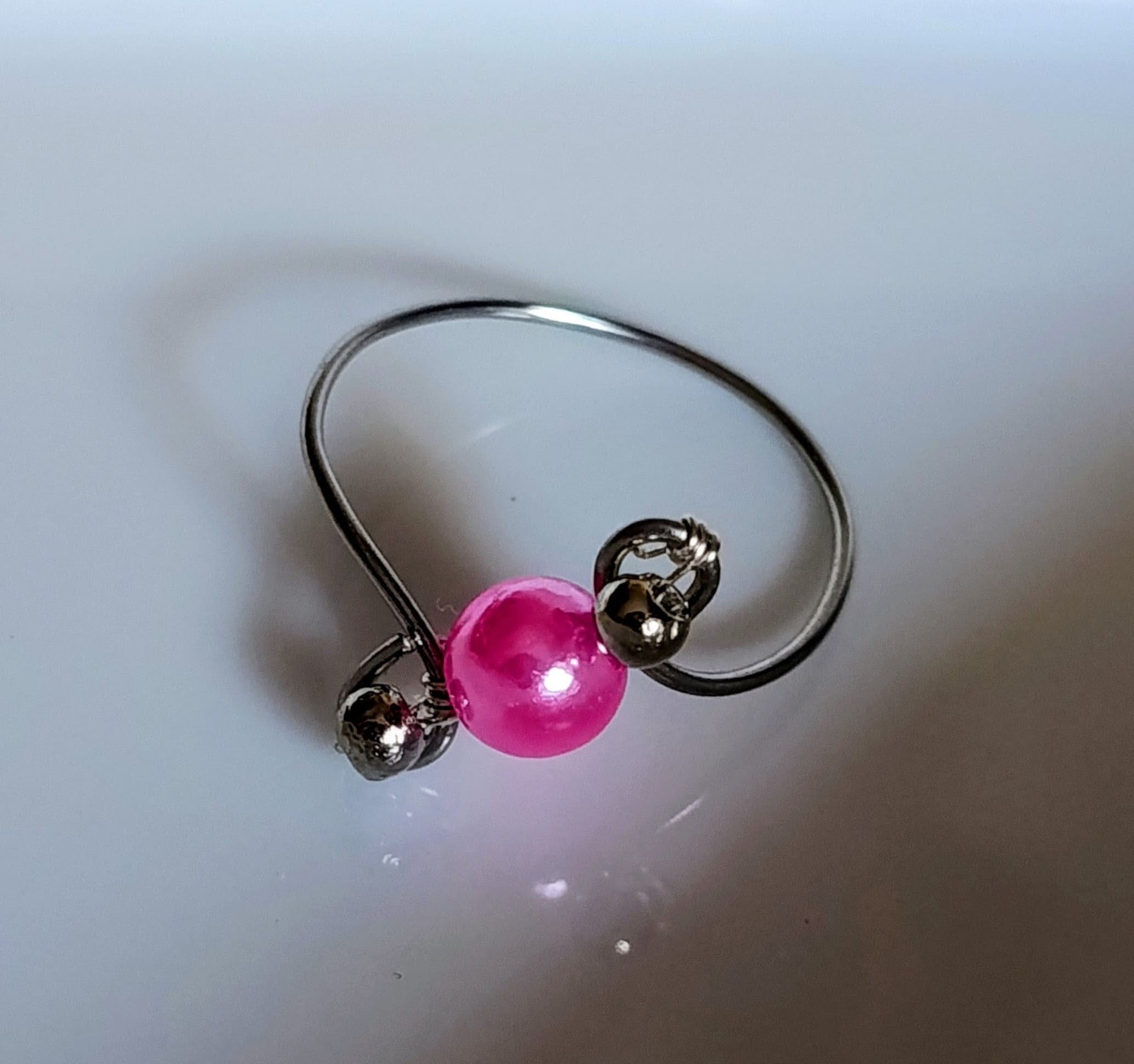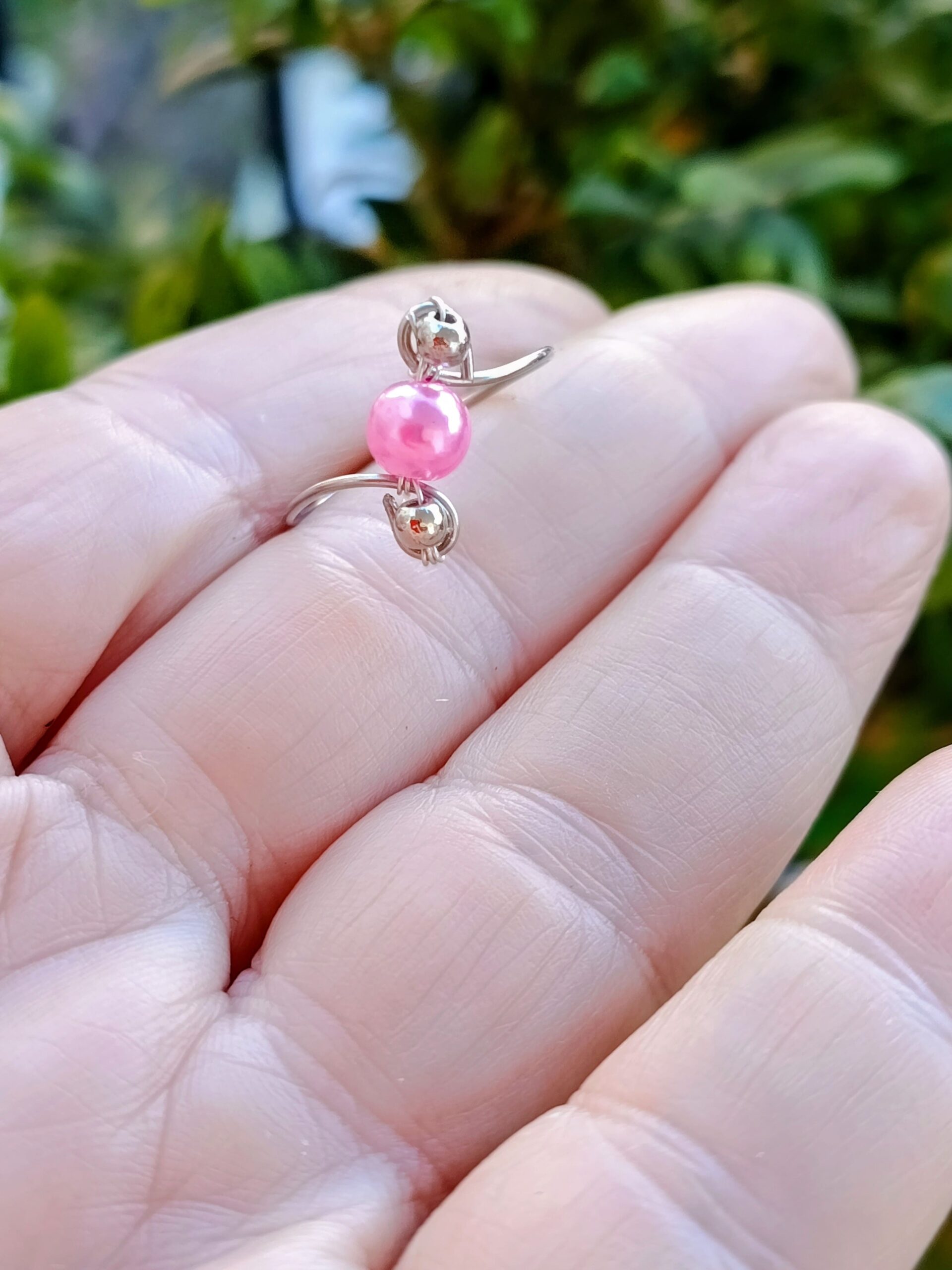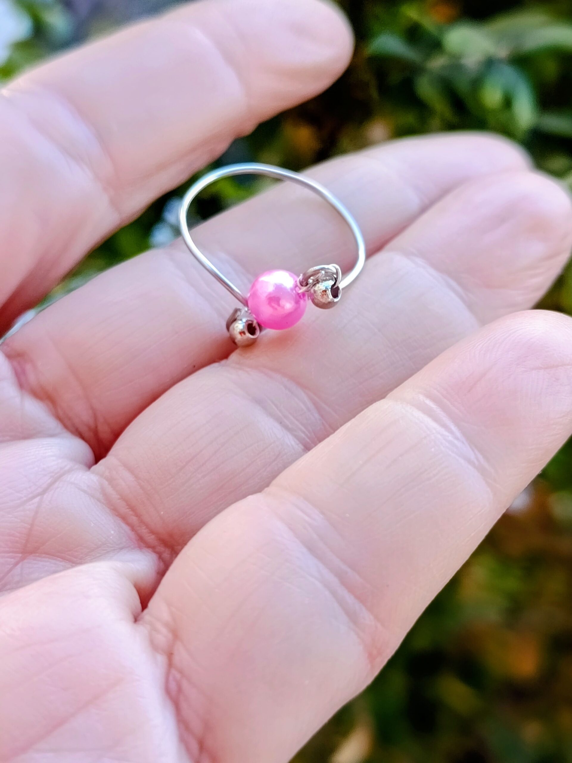 Είναι με ατσάλινο σύρμα και με ροζ περλέ χάντρα στο κέντρο του και ασημένιες χαντρούλες!