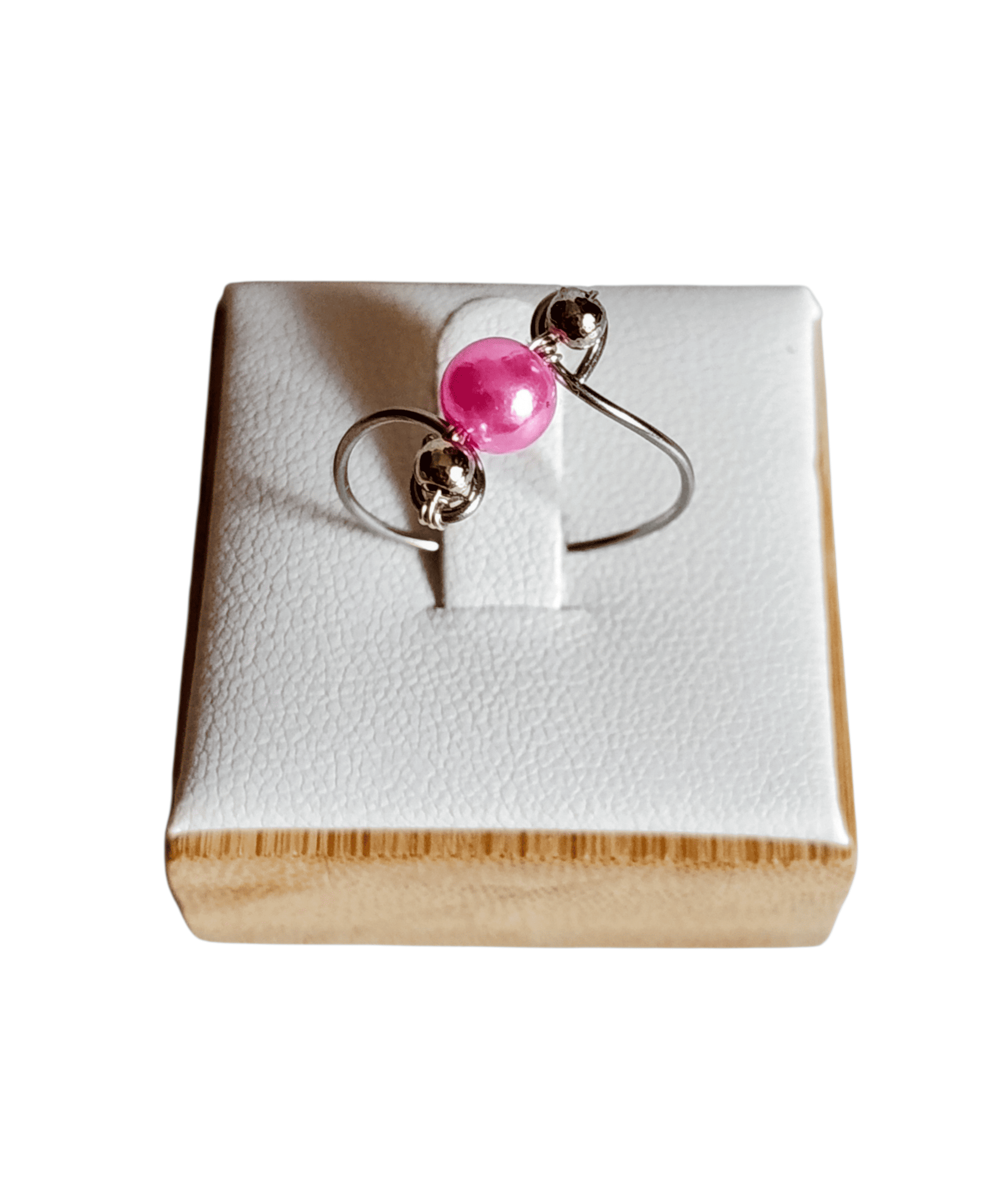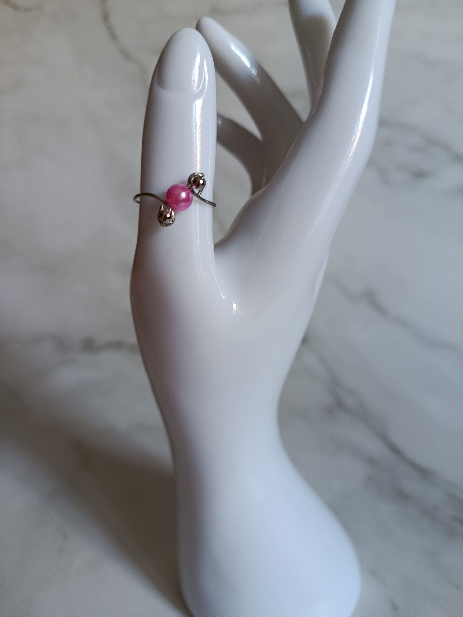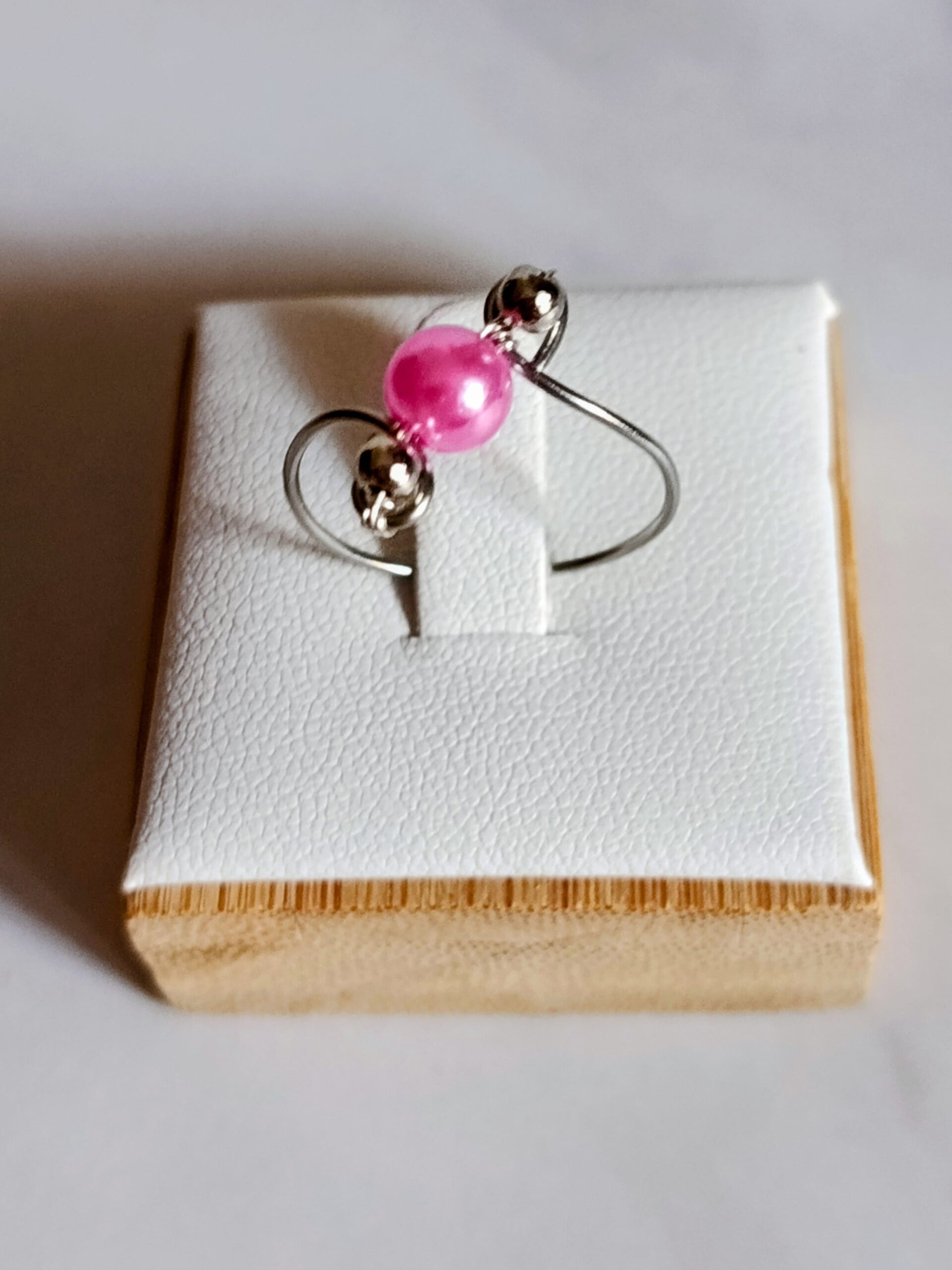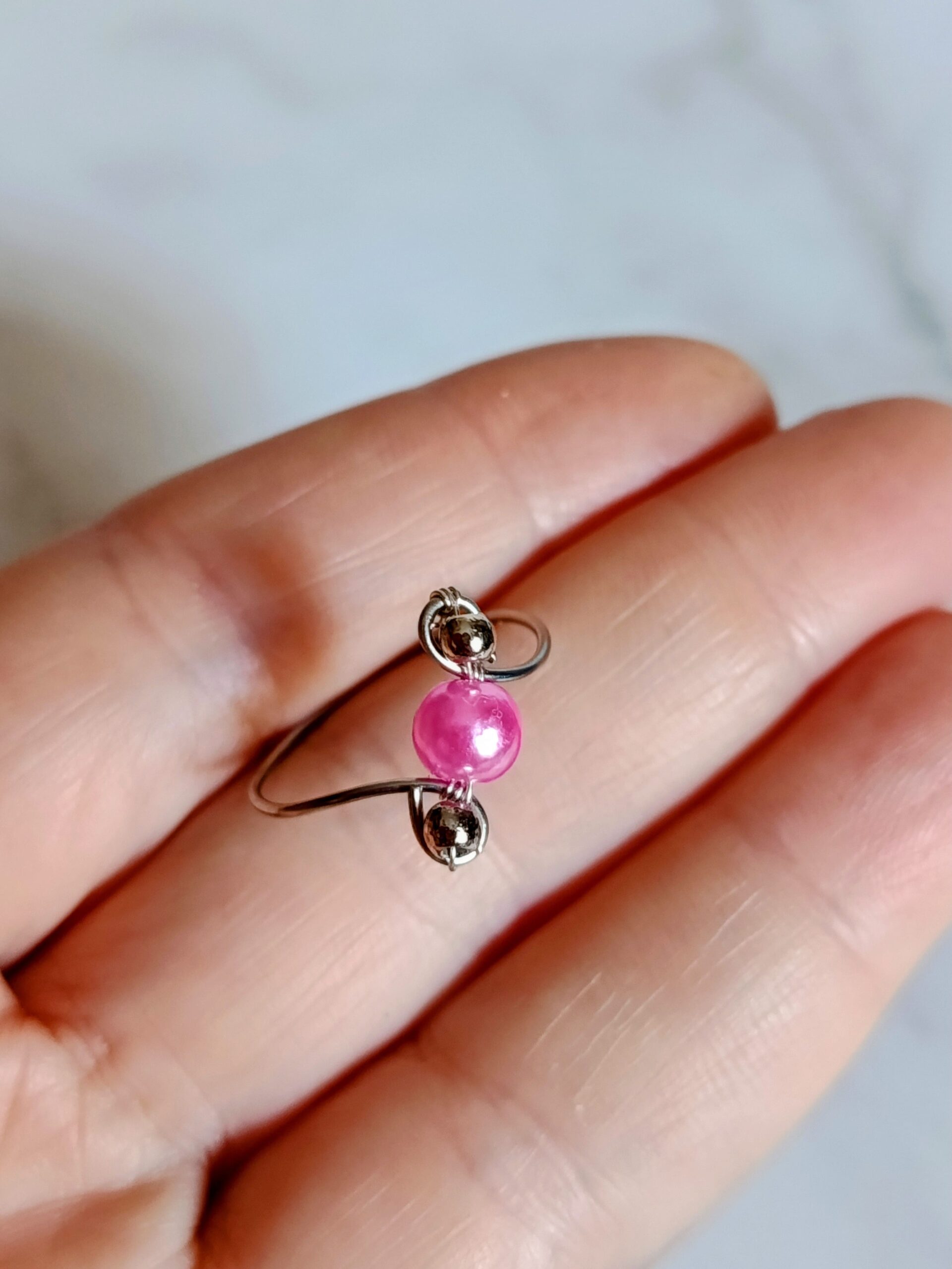 Είναι με ατσάλινο σύρμα και με ροζ περλέ χάντρα στο κέντρο του και ασημένιες χαντρούλες!