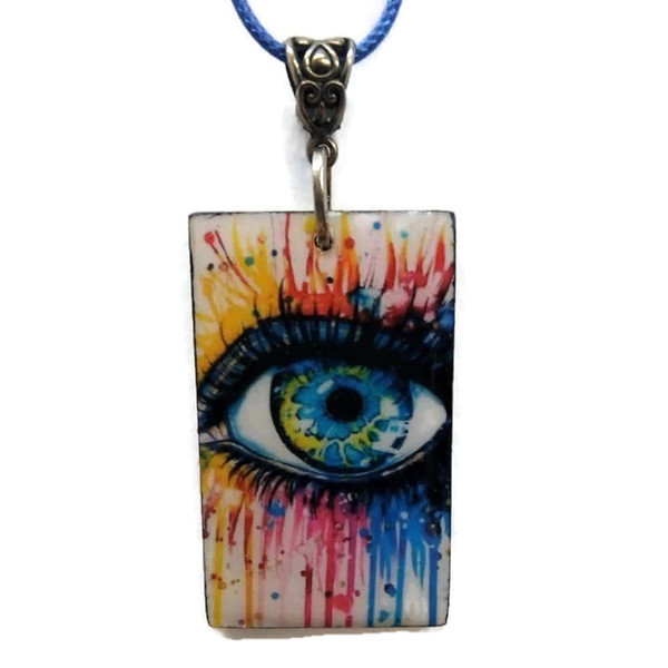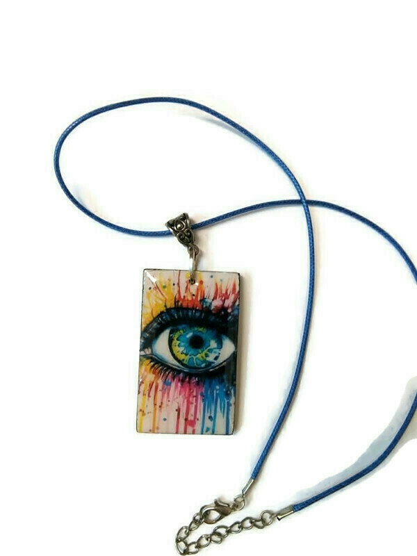 Ξύλινο Κολιέ Μάτι με Υγρό Γυαλί Πολύχρωμο και Κοντό Μπλε Κορδόνι