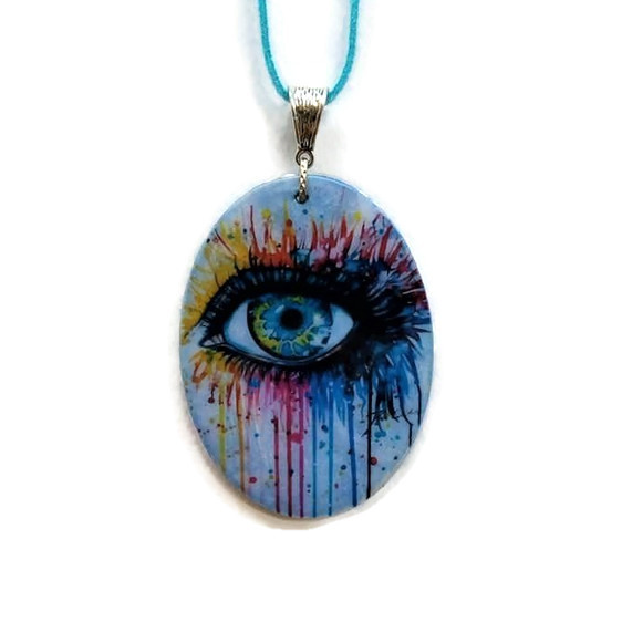 Ξύλινο κολιέ μάτι με υγρό γυαλί από την μία πλευρά και με ντεκουπαζ από την πίσω πλευρά. Οβαλ 7χ5 εκ. Μακρύ δερμάτινο κορδόνι.