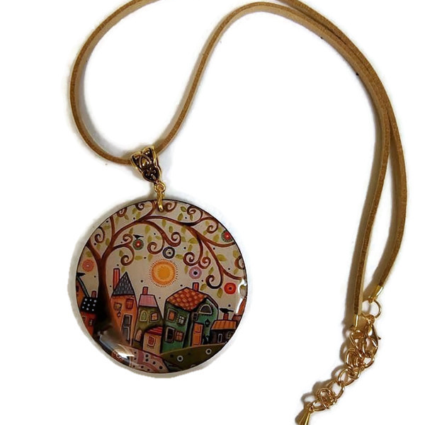 Αυτό το χειροποίητο ξύλινο κολιέ με στρογγυλό μενταγιόν διαμέτρου 5 εκ. και υγρό γυαλί αποτελεί μια μοναδική προσθήκη στη συλλογή σας. Το πολύχρωμο σχέδιο του μενταγιόν συνδυάζεται αρμονικά με το κοντό δερμάτινο κορδόνι, δημιουργώντας ένα κομψό και εντυπωσιακό κόσμημα που ταιριάζει σε κάθε περίσταση.