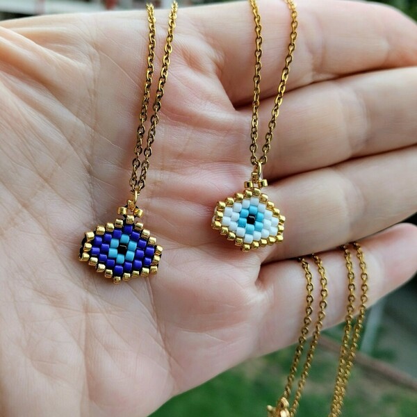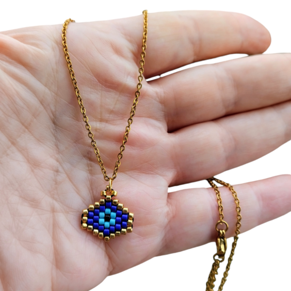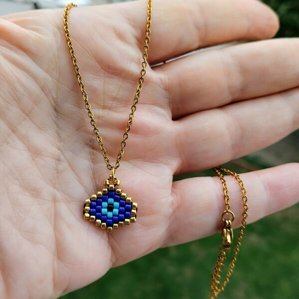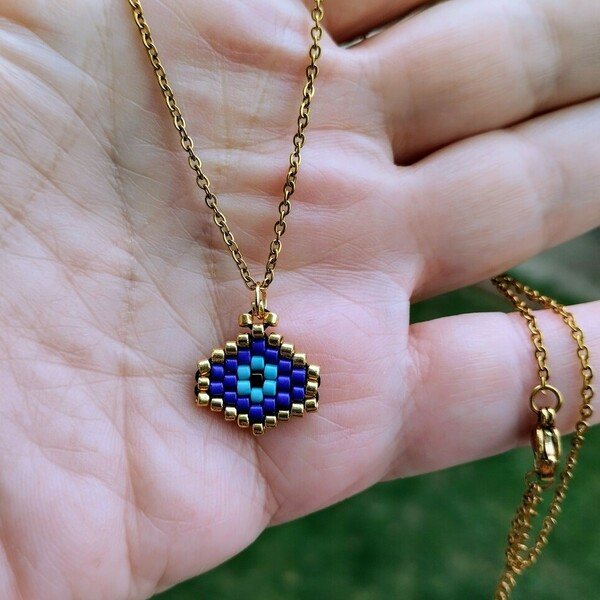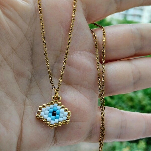 Αυτό το υπέροχο ατσάλινο κολιέ διαθέτει ένα μικρό μενταγιόν ματάκι σε μπλε σκούρο χρώμα, με γαλάζιο κέντρο και μια μικρή μαύρη χάντρα. Το ματάκι είναι φτιαγμένο με χάντρες Miyuki Delica υψηλής ποιότητας και κρέμεται από ατσάλινη επιχρυσωμένη αλυσίδα 18Κ. Με διαστάσεις 1,5 x 1,2 εκ., αυτό το κομψό μενταγιόν συνοδεύεται από αλυσίδα μήκους 40 εκ. και προέκταση 5 εκ., προσφέροντας κούμπωμα αυξομείωσης για τέλεια εφαρμογή. Μπορείτε να επιλέξετε το μενταγιόν και σε άσπρο χρώμα αντί για μπλε.
