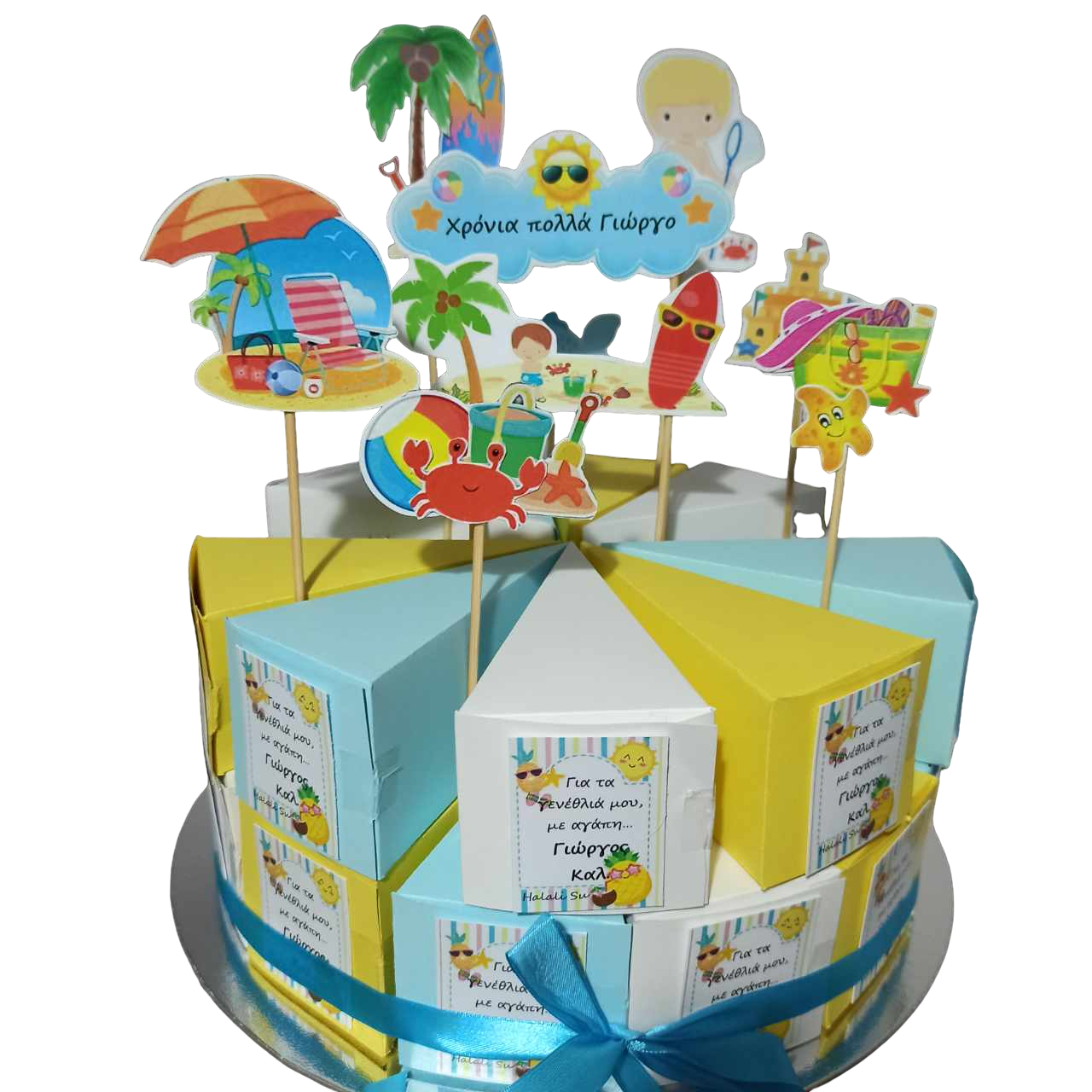 Η χάρτινη τούρτα με θέμα το καλοκαίρι είναι η τέλεια επιλογή για να κάνετε το καλοκαιρινό σας πάρτι αξέχαστο! Η τιμή περιλαμβάνει 18 χειροποίητα κομμάτια από χαρτόνι σε χρώματα γαλάζιο, κίτρινο και λευκό. Κάθε κομμάτι είναι γεμάτο με καλοκαιρινές εκπλήξεις και έτοιμο να μοιραστεί στους μικρούς καλεσμένους σας.